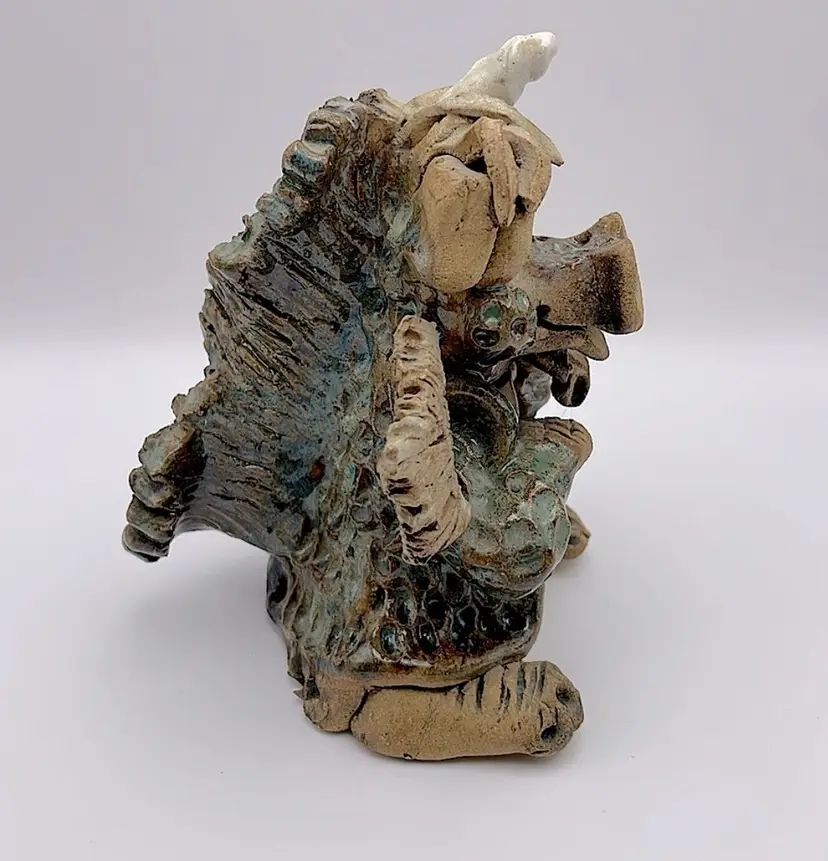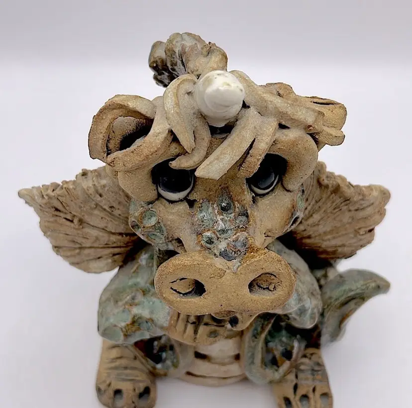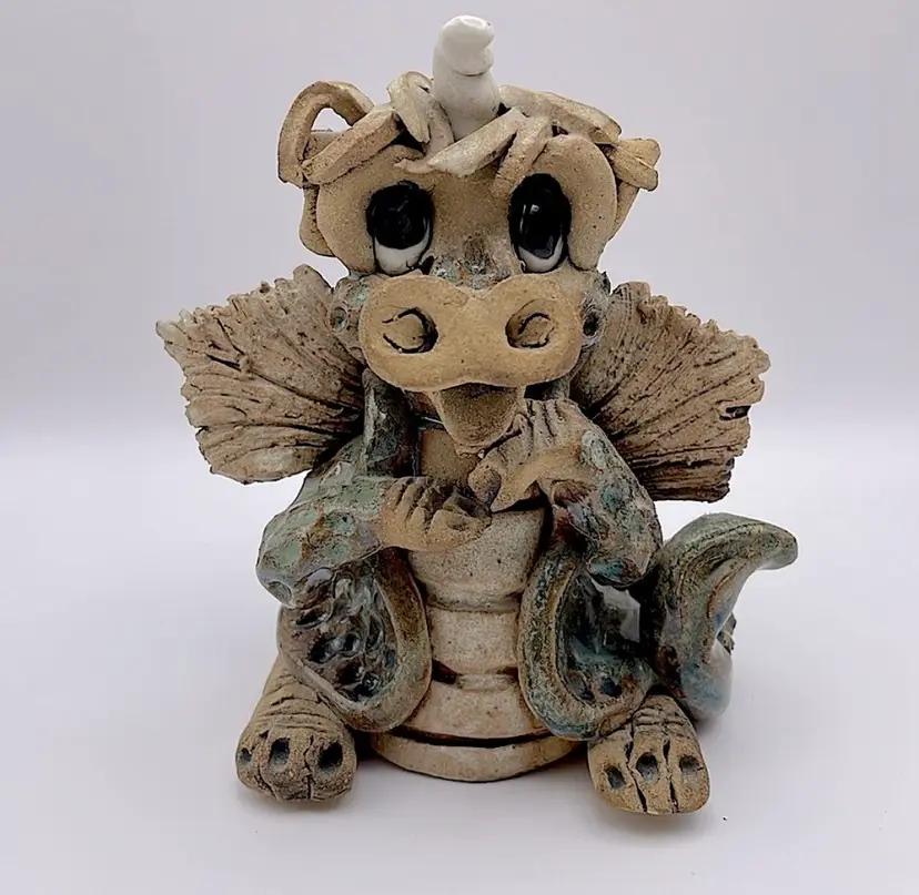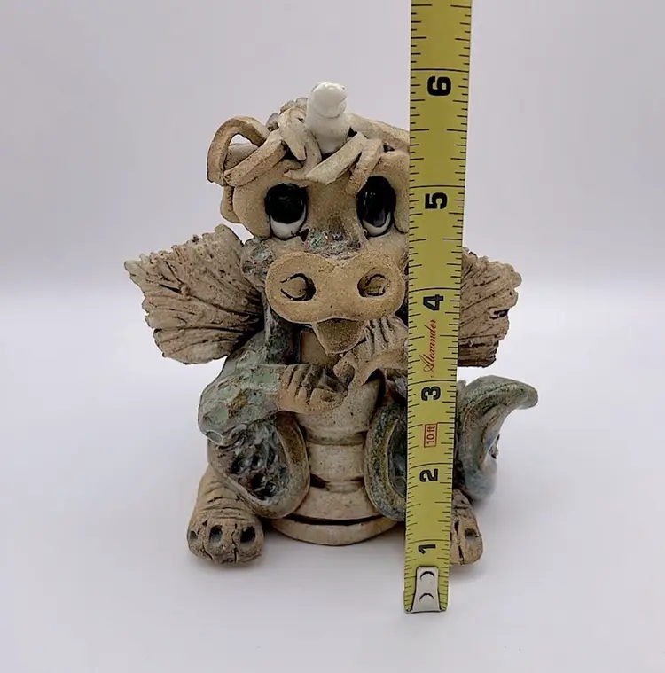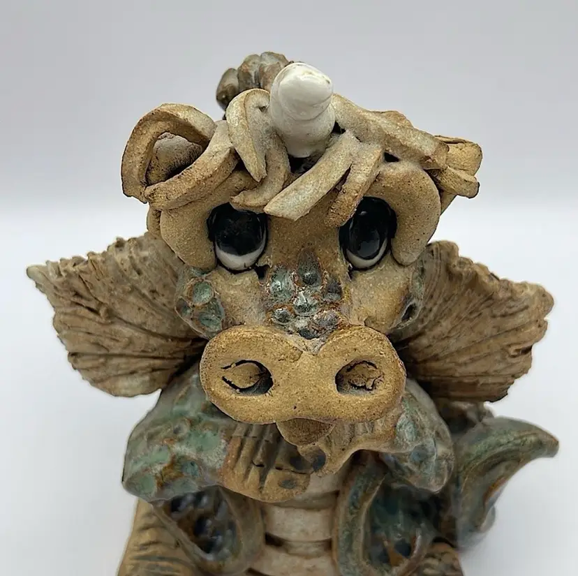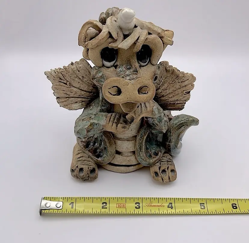 Handmade, Signed, Clay, Wide Eyed Dragon Figurine, Green and White Glaze, 6” Please see pictures for measurements.