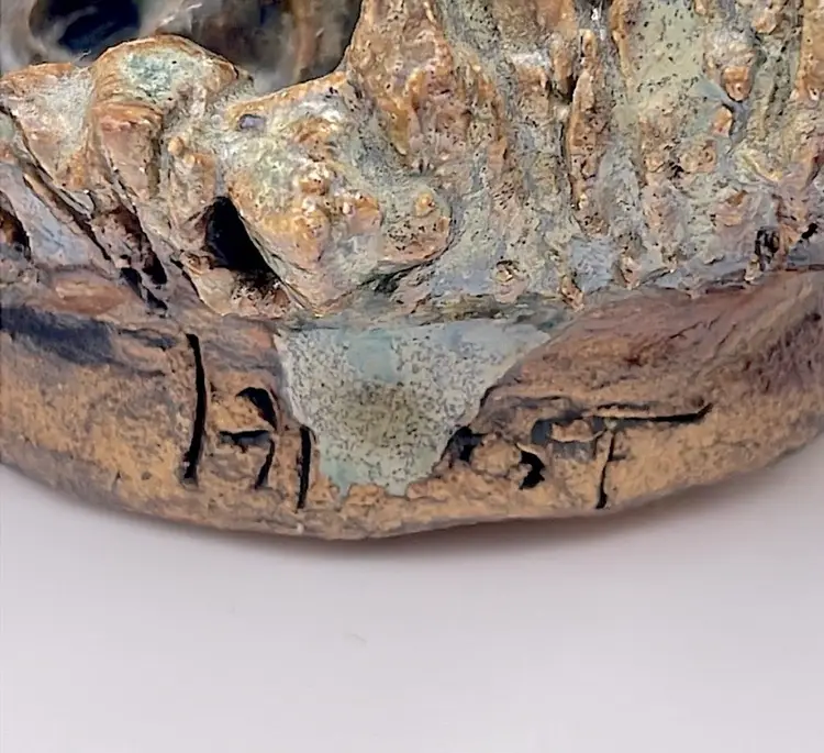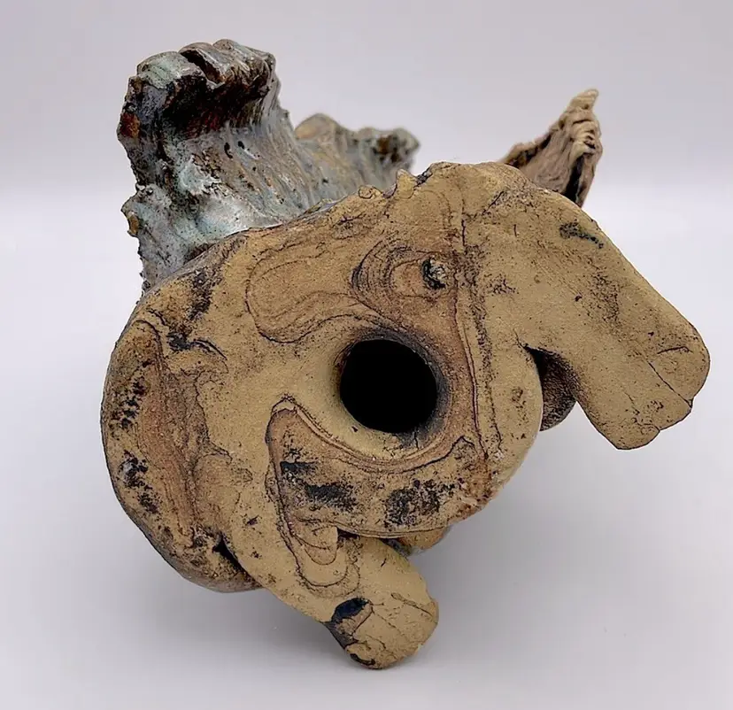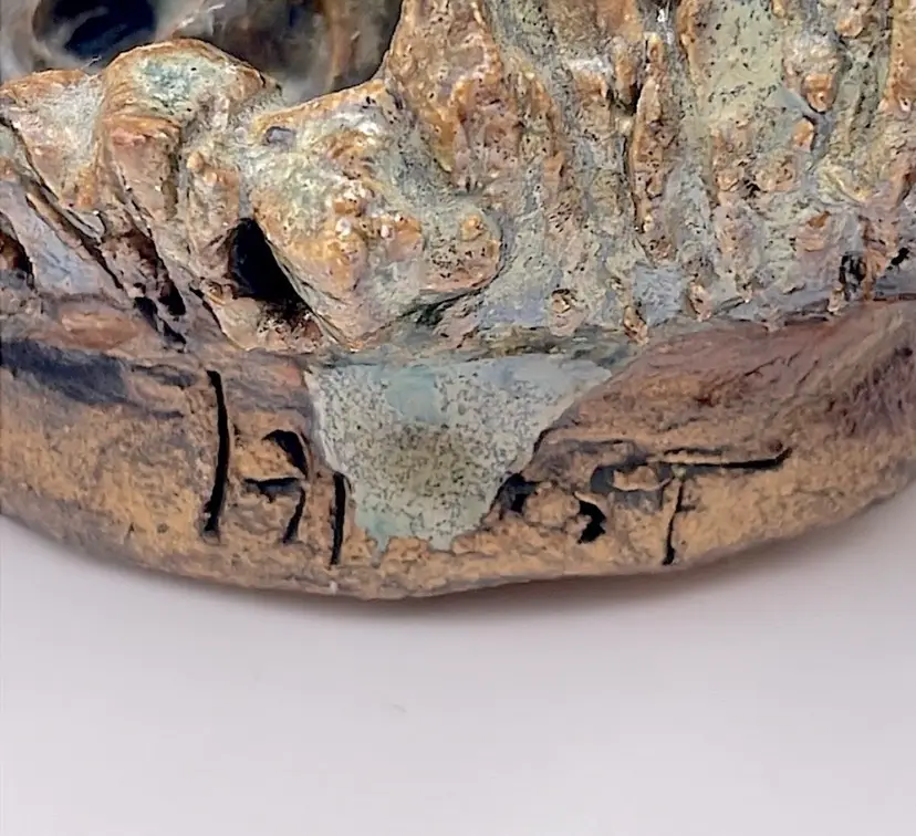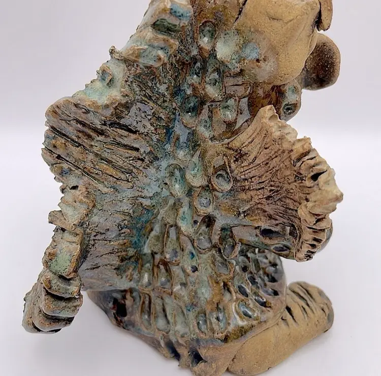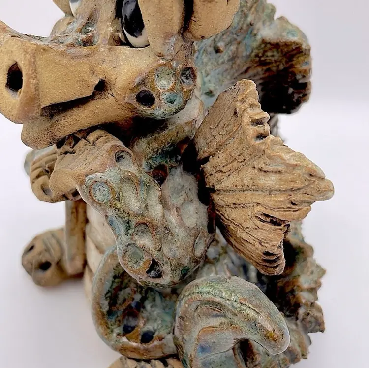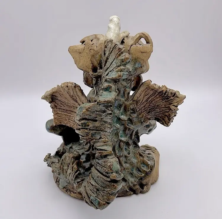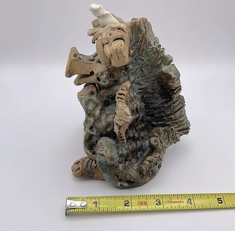 Handmade, Signed, Clay, Wide Eyed Dragon Figurine, Green and White Glaze, 6” Please see pictures for measurements.