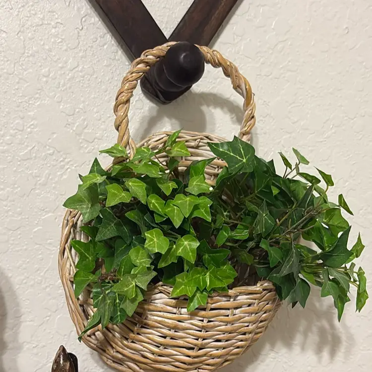 Hanging wicker wall pocket.