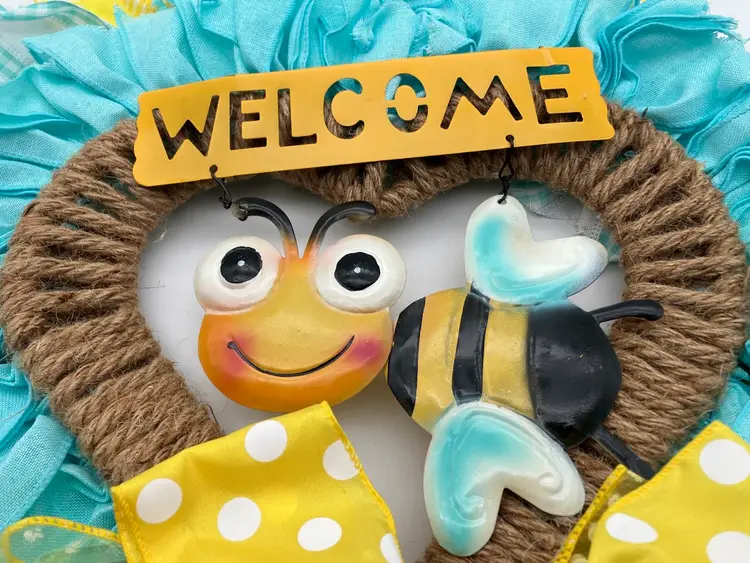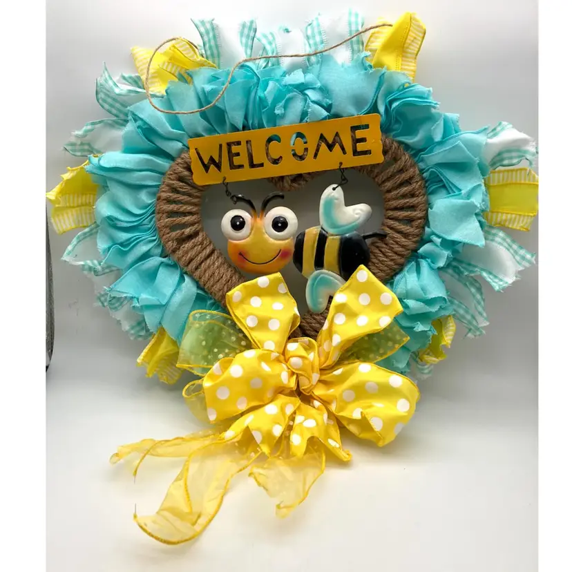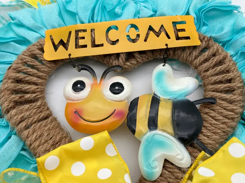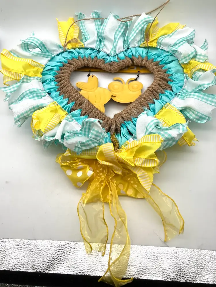 This wreath is one of the cutest things I have seen! It was made by a local crafter and still had her $45 price sticker on it when found. It’s in excellent condition. You may need to fluff the ribbons again after shipping. Measures 24” tall to bottom of bow and around 18” without bow. Width is around 18” as well.