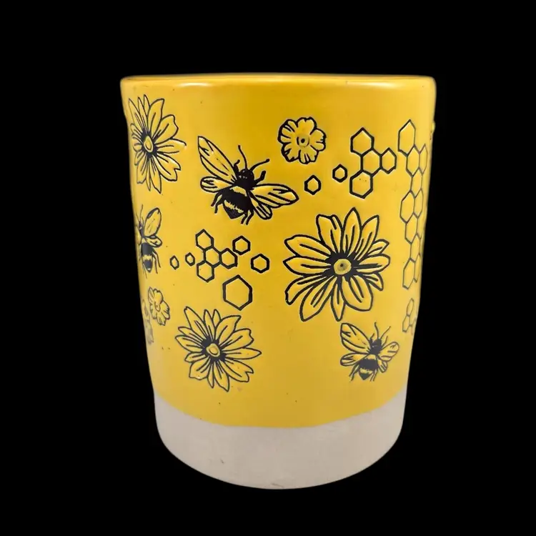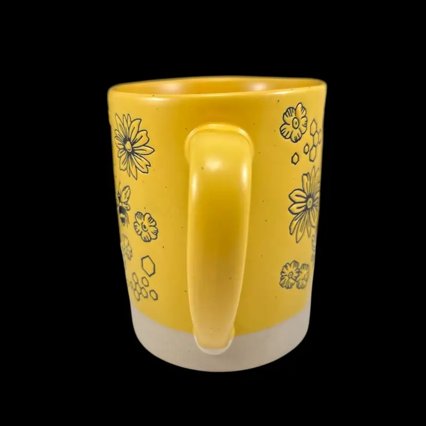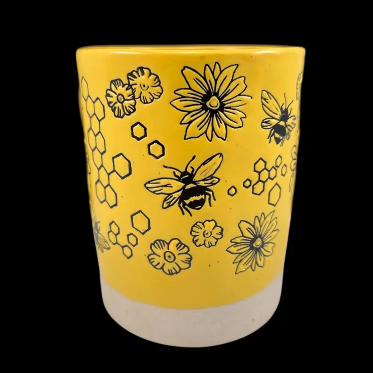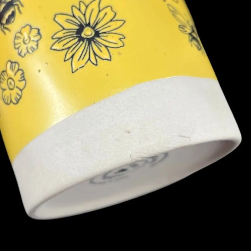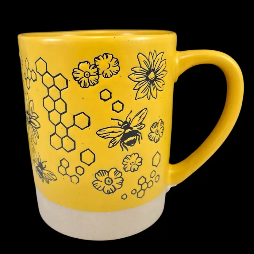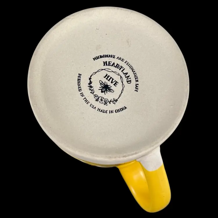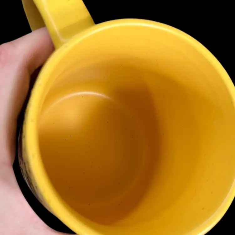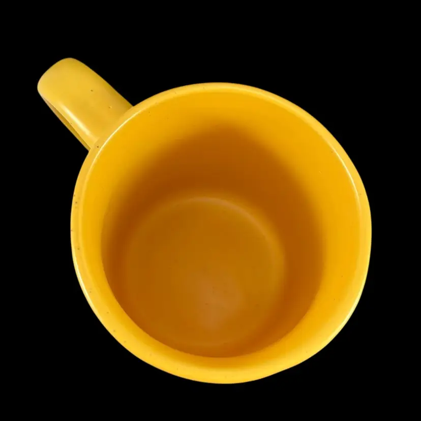 Approximately 4.5” tall, just over 3.5” diameter, and just over 5” wide including the handle. Yellow glaze with small black flecks. The bottom portion of the mug is left as unglazed stoneware. No chips or cracks. Please see second to last photo to see a manufacturing defect on the bottom rim.