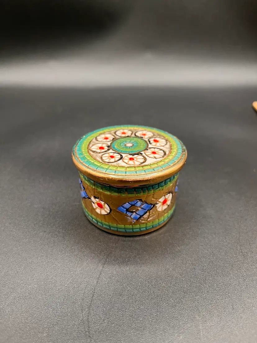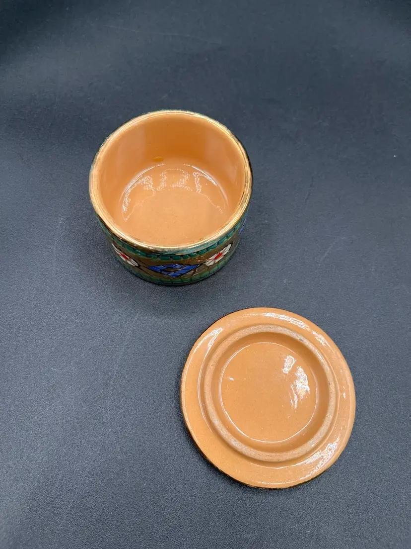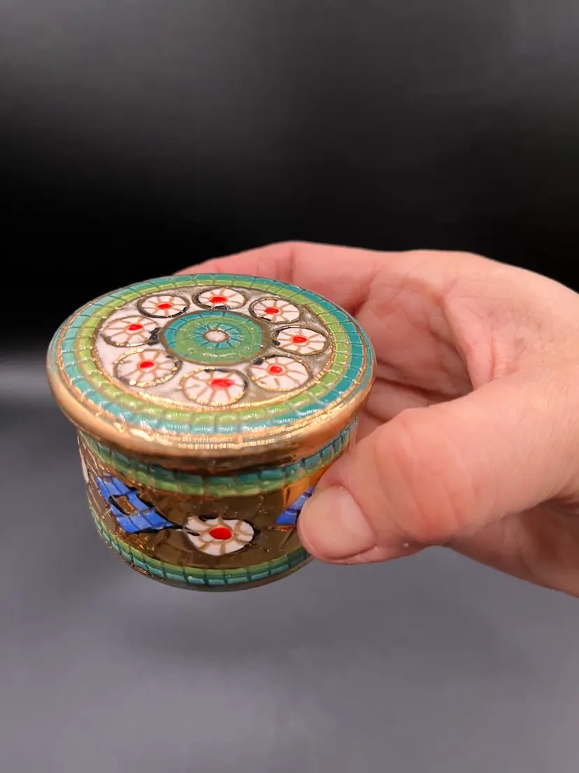 Italian Assisi Pottery Micro Mosaic Lidded Trinket / Votive Candle 2.5”D