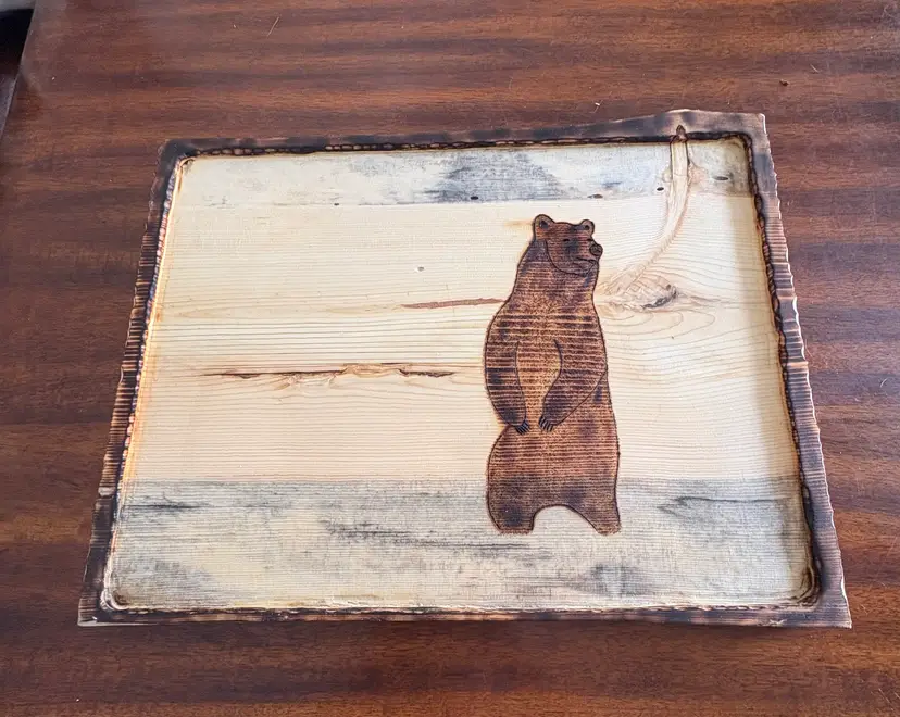 This is a live edge hand burnt serving platter made in Jackson Hole, Wyoming of the iconic grizzly bear 399. This is made out of pine with built-in handles and has a risen perimeter so nothing spills. Product dimensions are roughly 20”x15”x 1 1/4 thick.