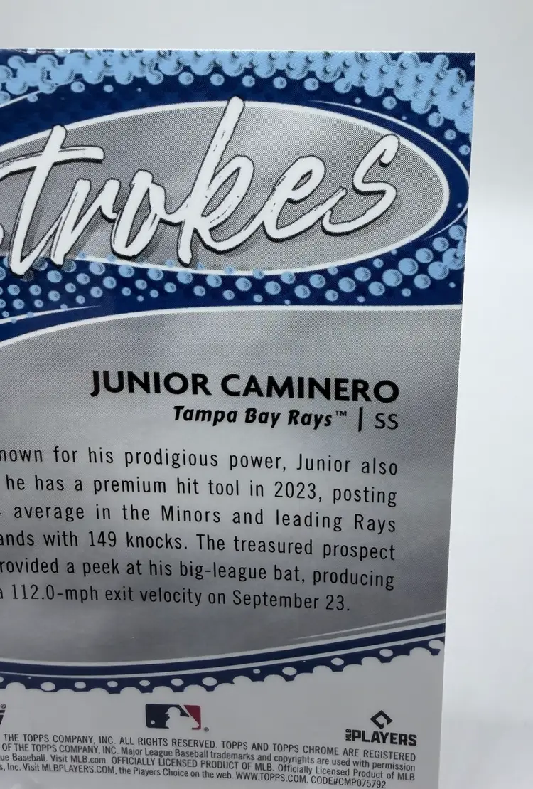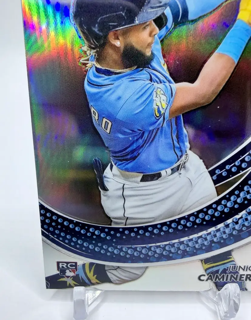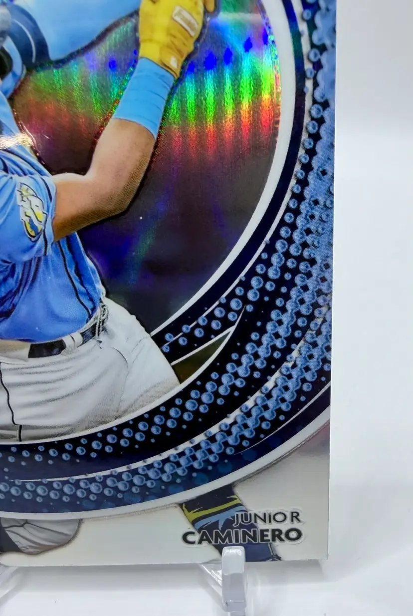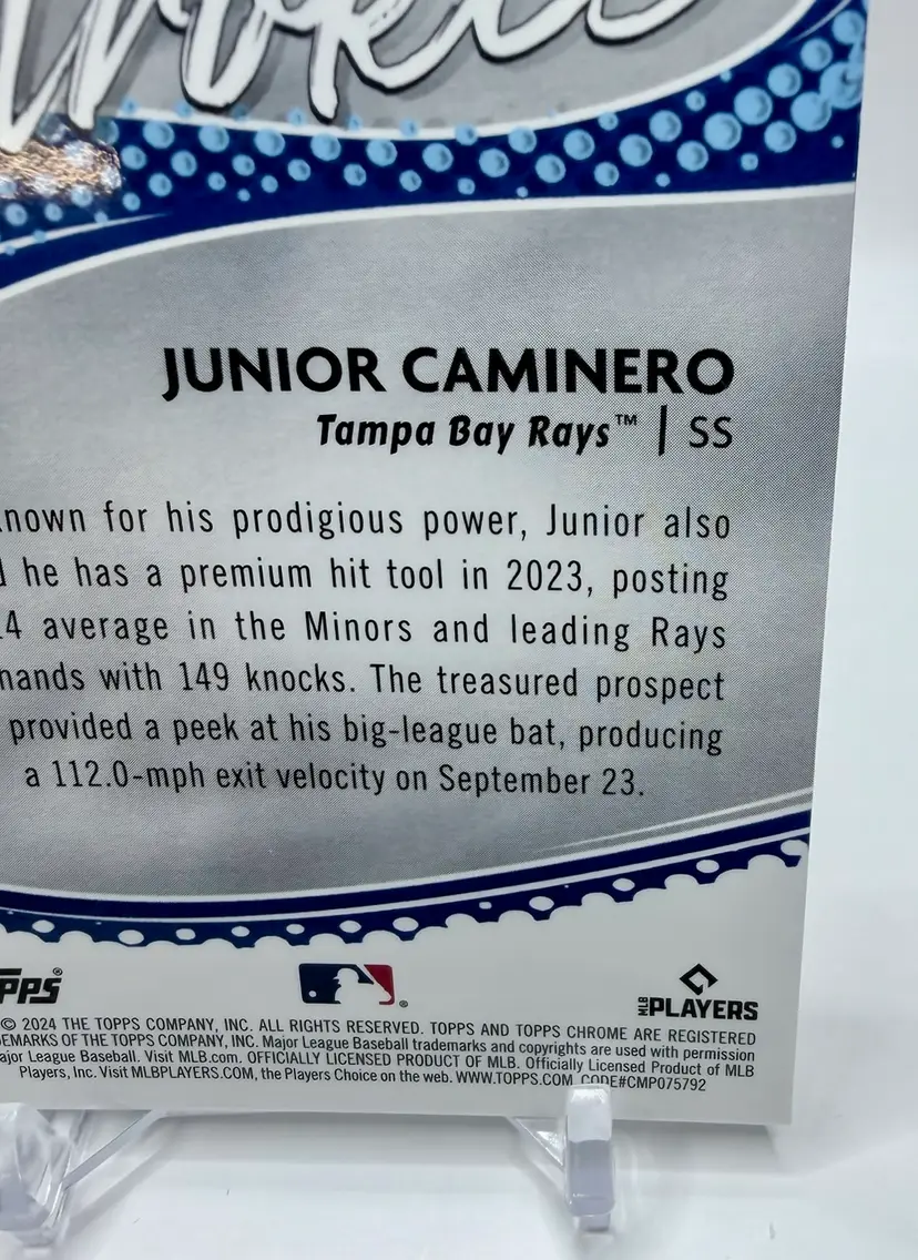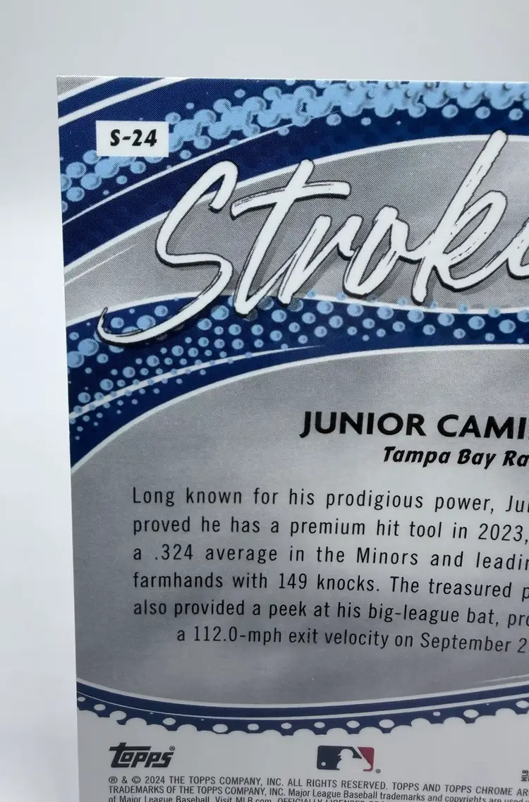 2024 Topps Chrome Rookie trading card featuring Junior Caminero of the Tampa Bay Rays. This original English-language card is part of the Major League Baseball set and is a parallel variety with a Chrome finish.