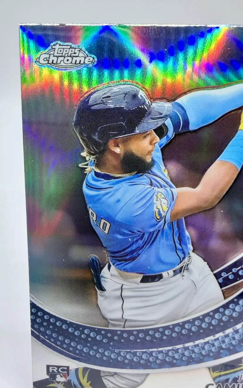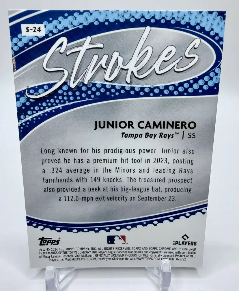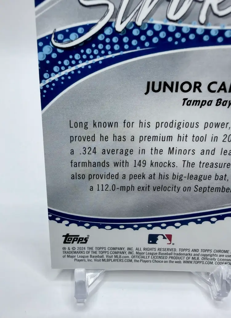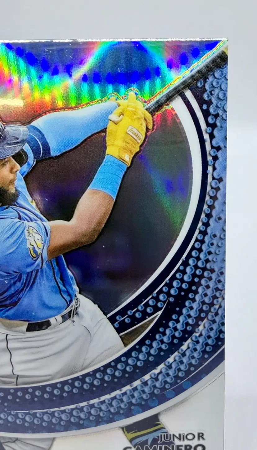 2024 Topps Chrome Rookie trading card featuring Junior Caminero of the Tampa Bay Rays. This original English-language card is part of the Major League Baseball set and is a parallel variety with a Chrome finish.