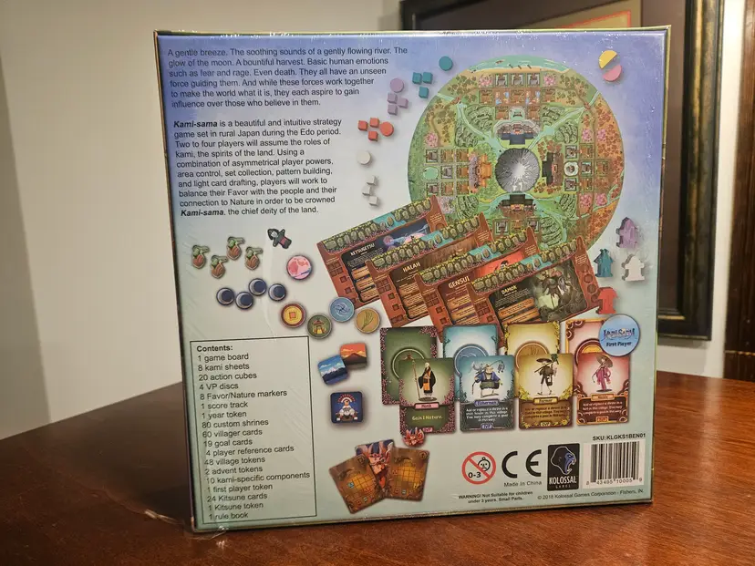 Contains: 1 Game Board 8 Kami Sheets 20 Action Cubes 4 VP Discs 8 Favor/Nature Markers 1 Score Track 1 Year Token 80 Custom Shrines 60 Villager Cards 19 Goal Cards 4 Player Reference Cards 48 Village Tokens 2 Advent Tokens 10 Kami-Specific Components 1 First Player Token 24 Kitsune Cards 1 Kitsune Token 1 Rule Book