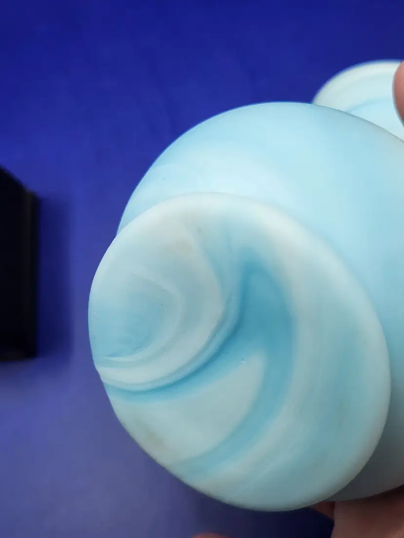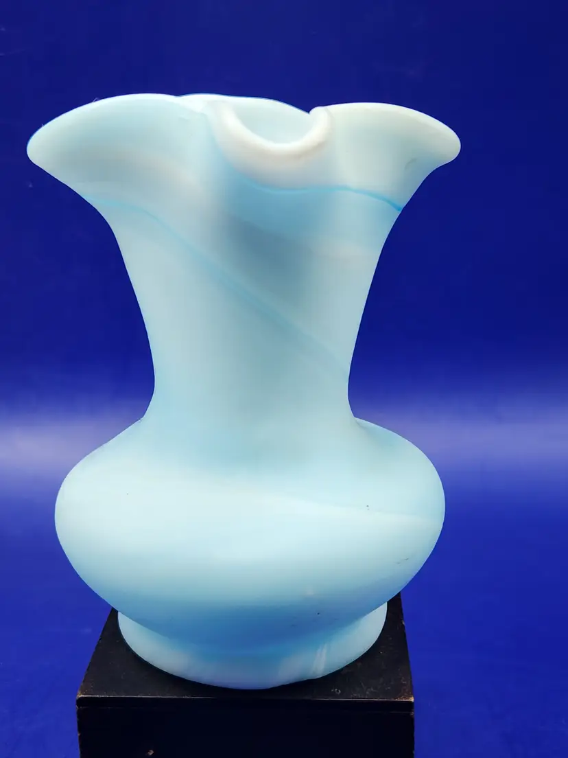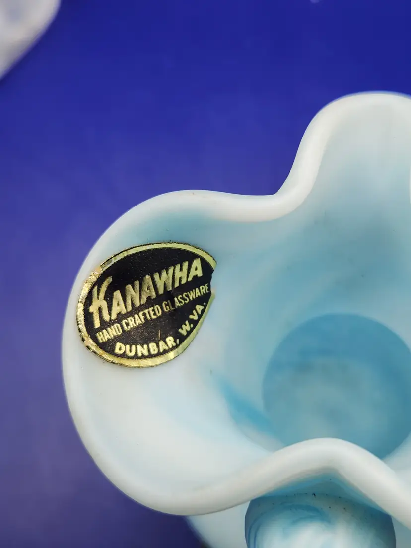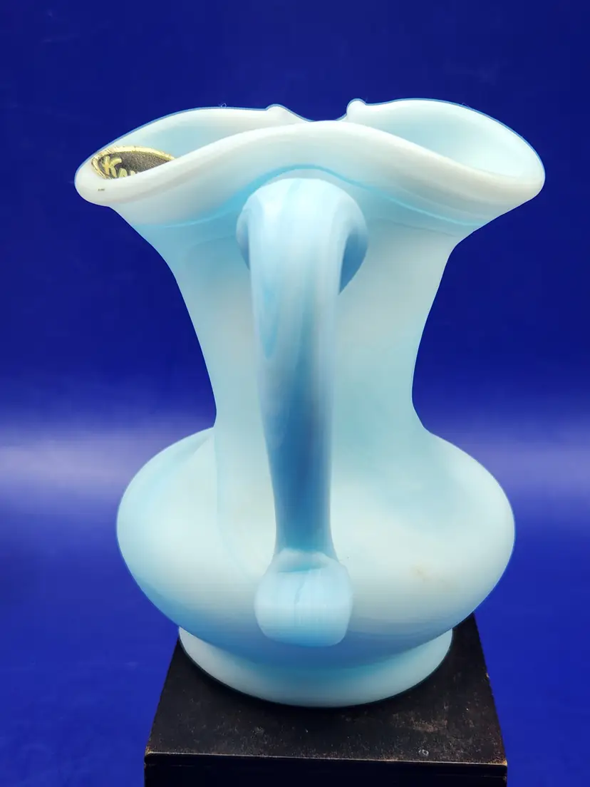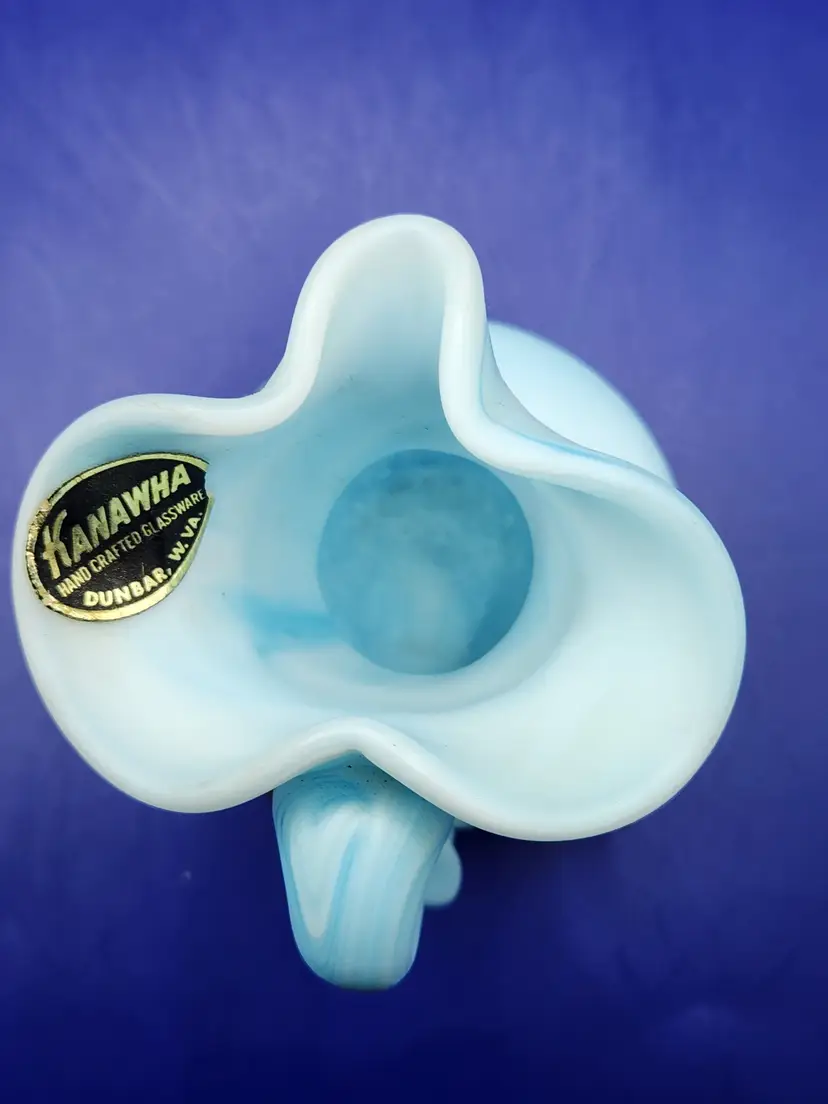 Kanawha Blue and White Slag Glass Pitcher Satin finish Measure 3 3/4 inches tall and 3 1/2 inches at widest No chips or cracks