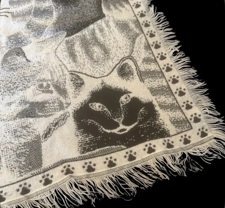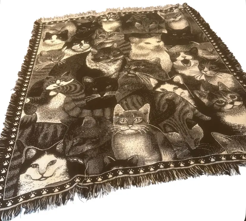 Kitty Cat Throw Blanket Black & White w/ Fringe Trim Edges 56” x 47” Cat Lovers