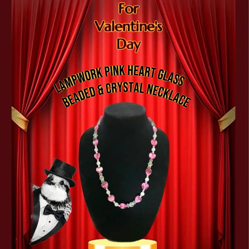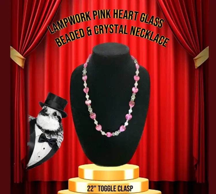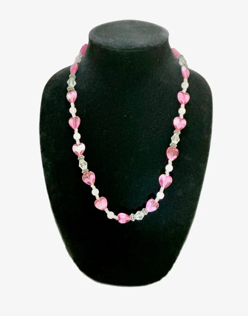 Handcrafted lampwork pink heart glass necklace accented with crystal and soft blush beads. Romantic, feminine, and perfect for Valentine’s Day or everyday wear. • Hand-beaded design • Lampwork glass heart beads • Crystal & Rose Quartz accents • Toggle clasp closure • Length: 22 inches