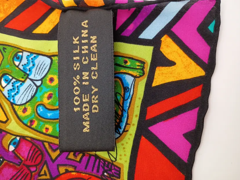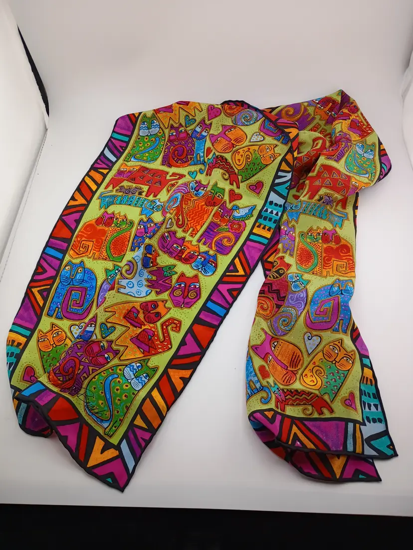 This is a beautiful Laurel Burch Celebrations silk scarf. It's in excellent condition with no stains, tears, or snags.