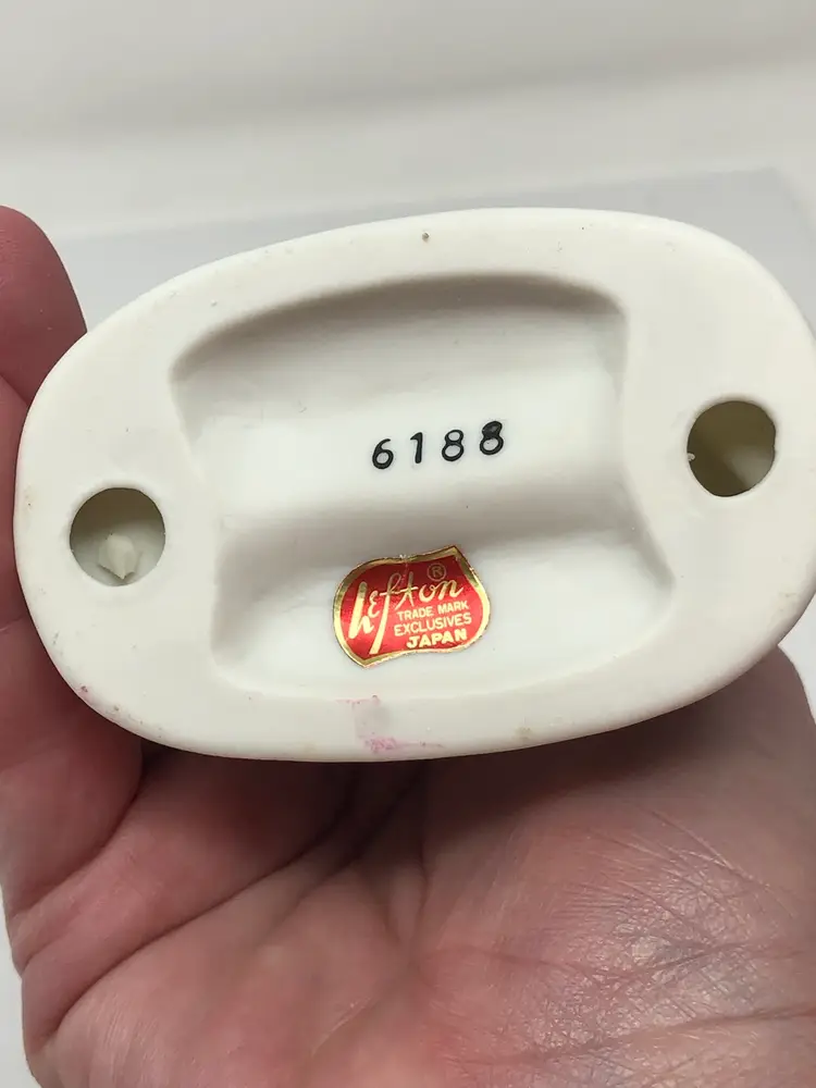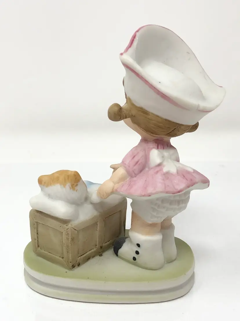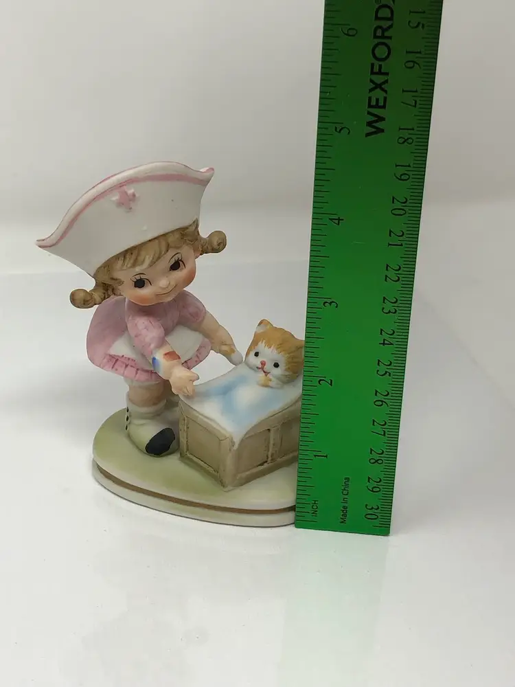 4 1/2" figurine of a little girl, playing nurse to her kitten. No chips or cracks, original Lefton sticker