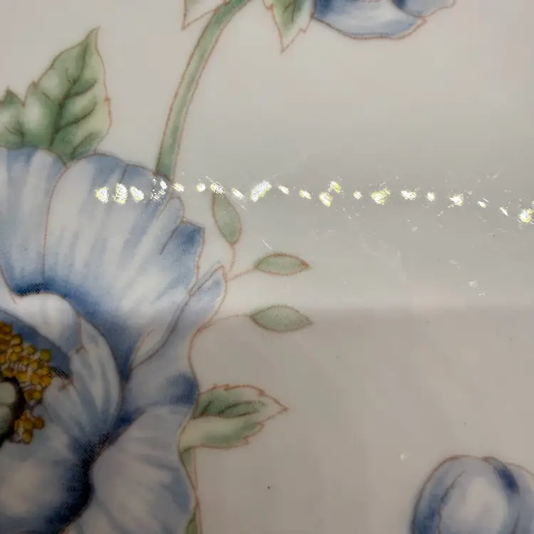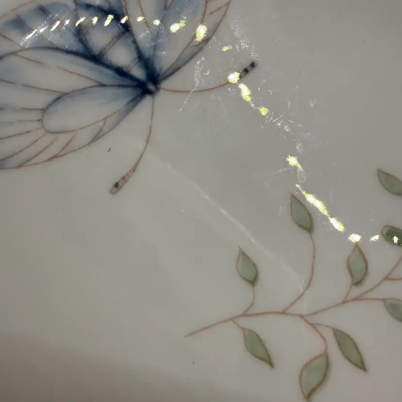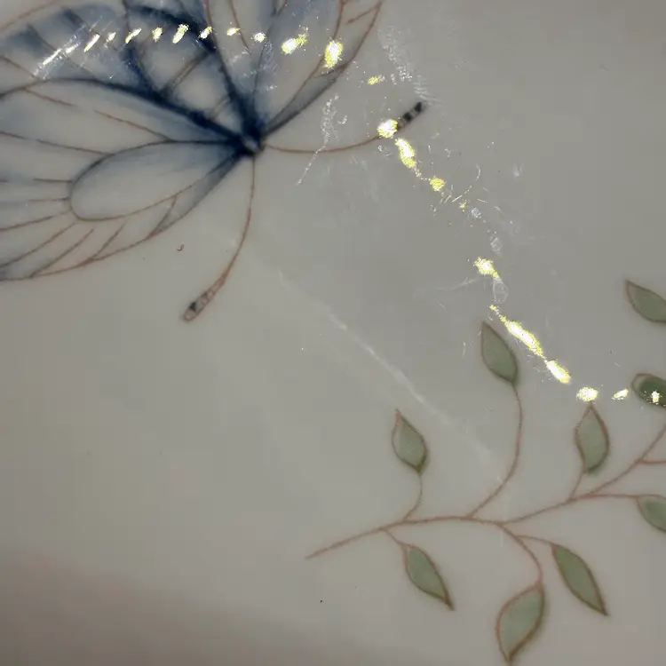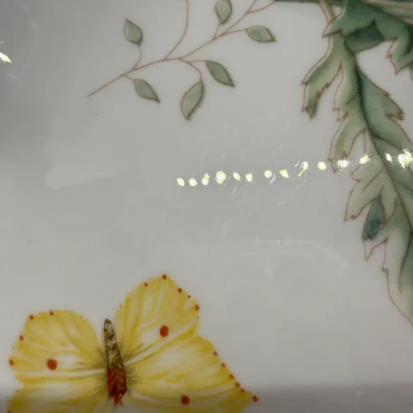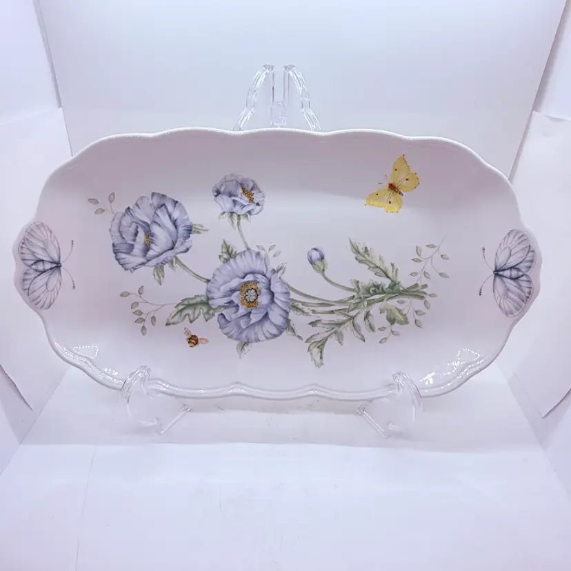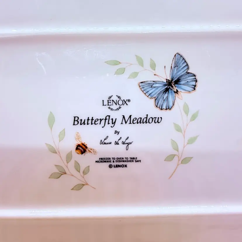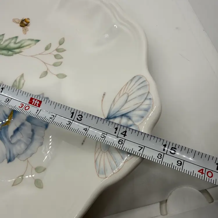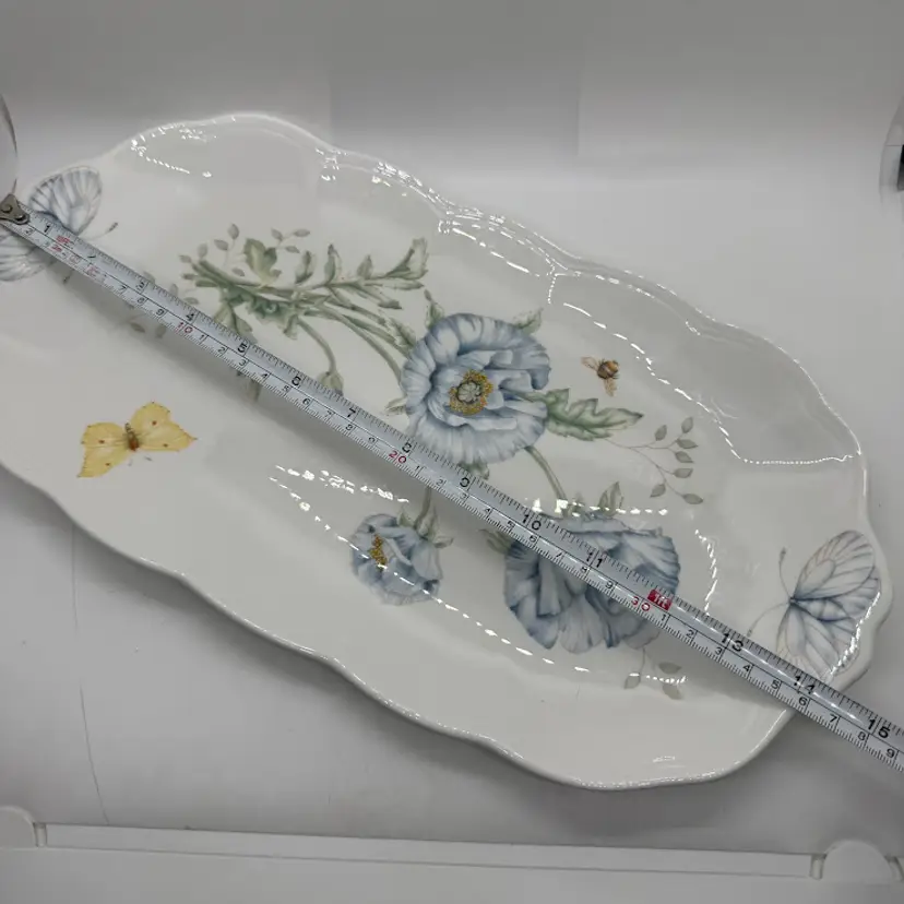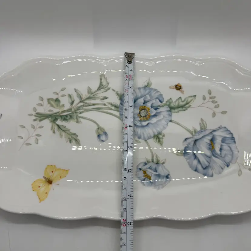 Lenox Butterfly Meadow Oblong Sandwich Serving Tray Serveware. Blue hydrangea flowers with a bee, butterflies, and moths. No chips or cracks. Signs of light wear and use such as surface scratching and scuffing. Please see pictures.