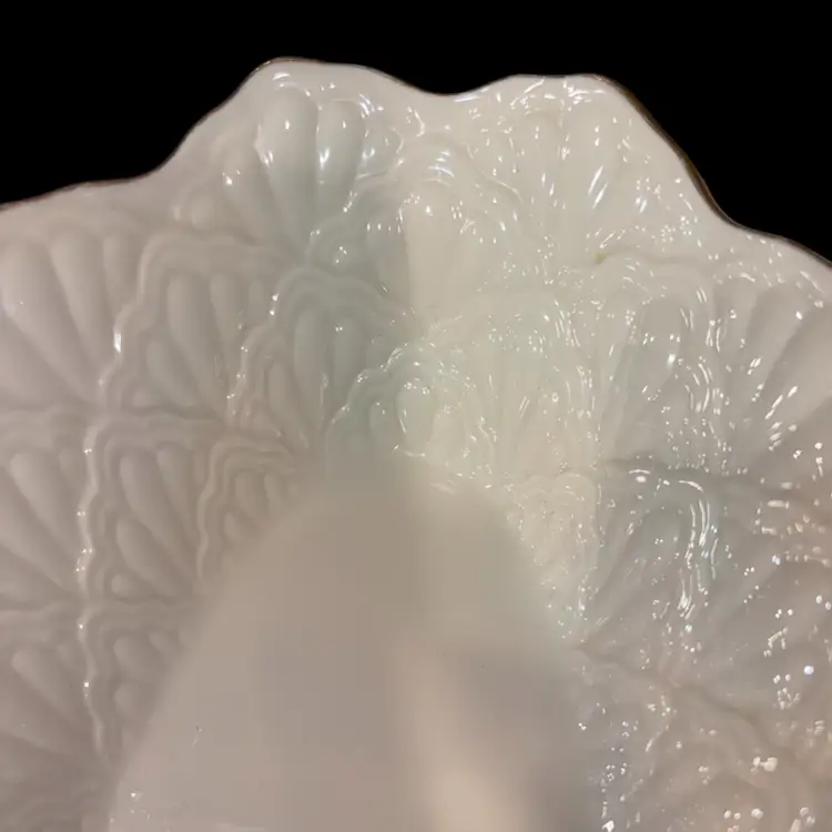 This pretty bowl has an embossed, repetitive fan or shell design that mimics fish scales or feathers. The pattern is on the interior and exterior, on all sides.