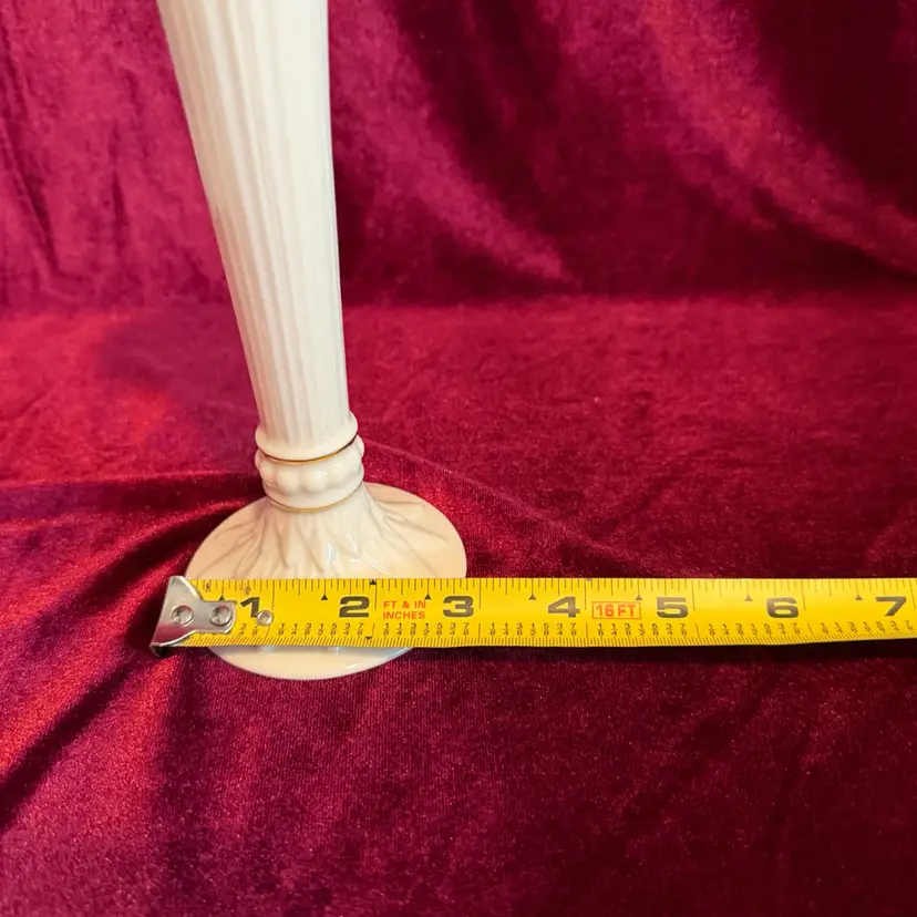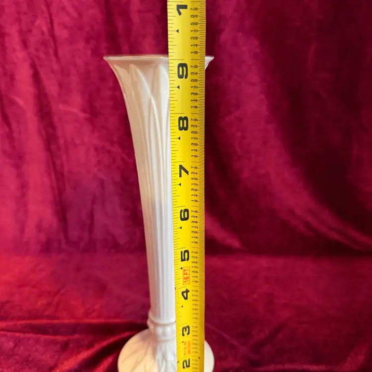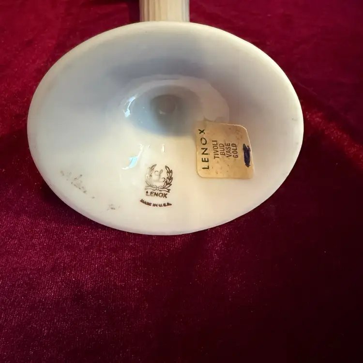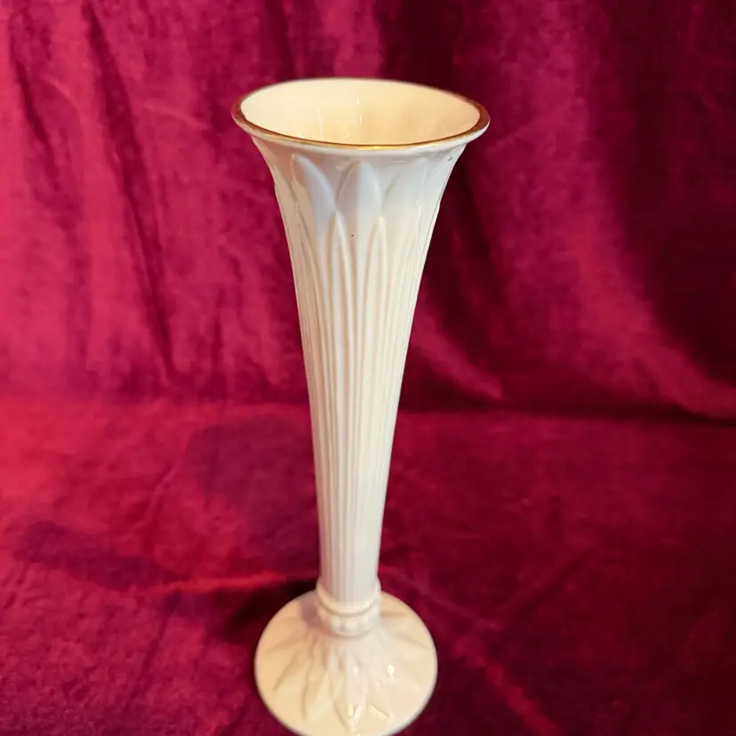 Lenox Tivoli collection fluted ivory porcelain bud vase. It features 24k gold trim and embossed leaf designs.