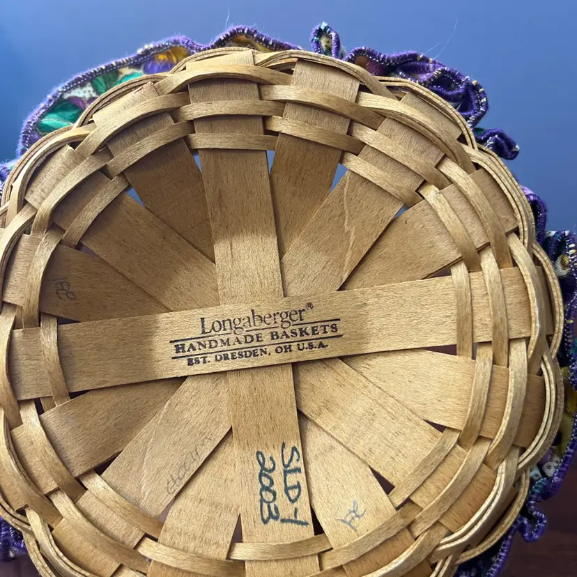 This particular basket, identified as a 1999 Small Easter Basket, likely features a decorative fabric liner or ruffle, common for seasonal items. The fabric pattern, with its purple, green, and yellow hues, suggests a connection to Mardi Gras or a similar festive occasion, adding to its collectible appeal. The leather handles and woven wood construction are hallmarks of Longaberger craftsmanship.