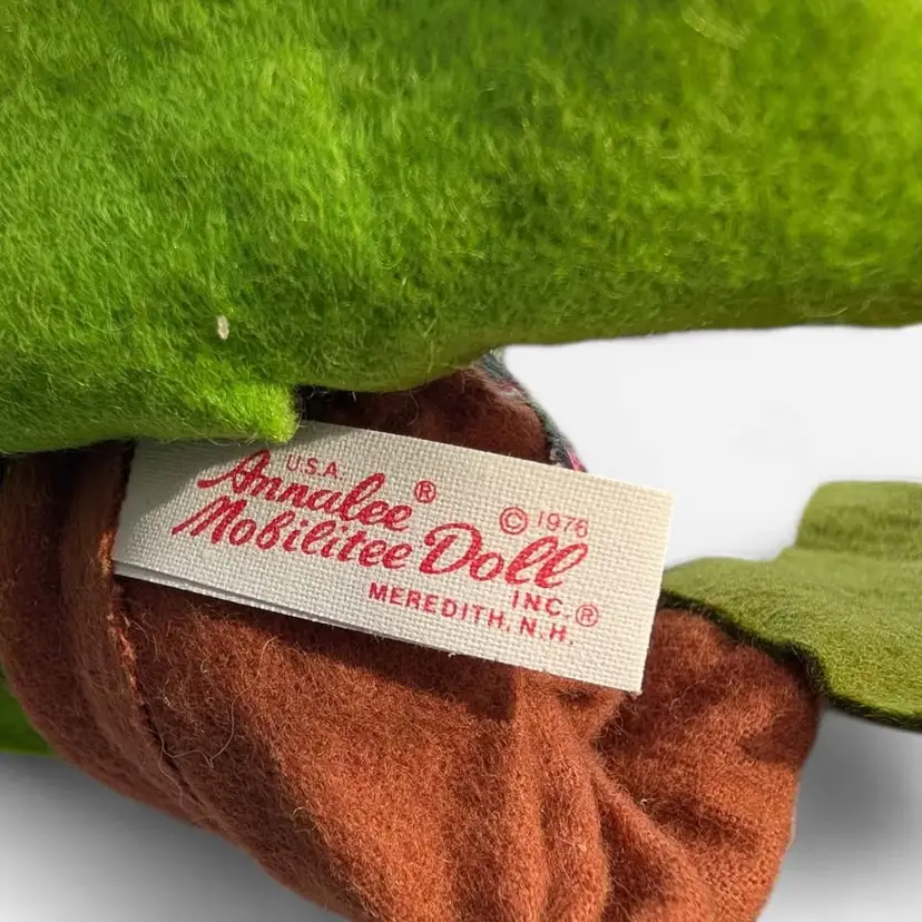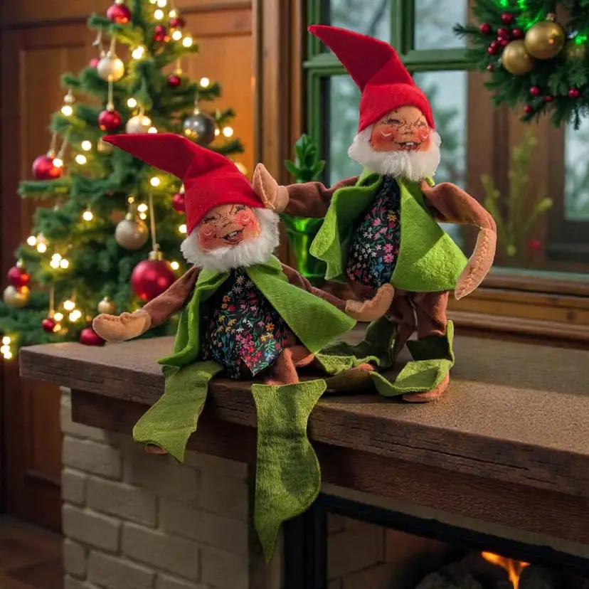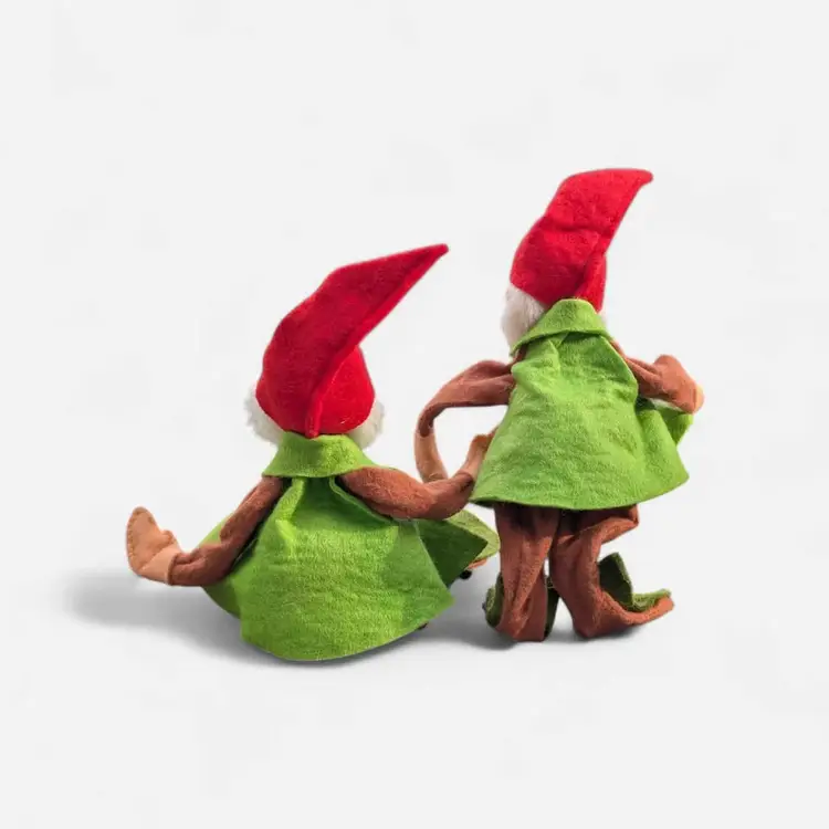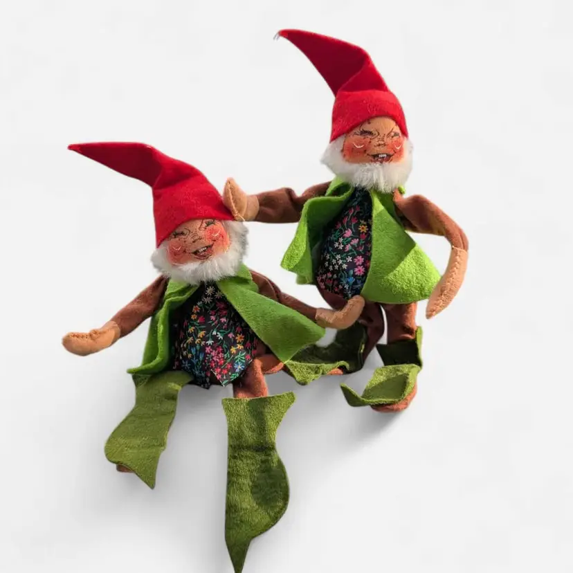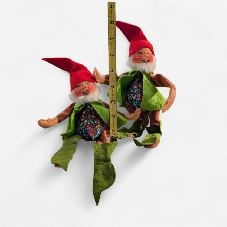 Lot Of 2 Vintage 1976 Annalee Mobilitee Christmas Elf Dolls. These adorable Annalee elves are perfect for the Holiday season and a great addition to any collection. They have red caps on and green vests and shoes with a floral patterned shirt underneath. These both have their original tags and are dated 1976. These can be posed to stand or sit - excellent condition - measurements are in the photos.