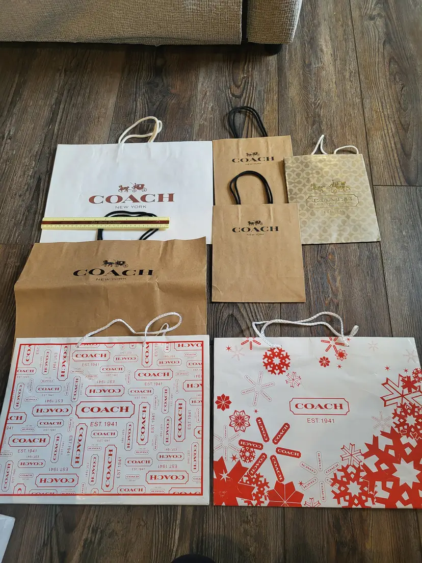 Nice shape set of 7 Coach shopping bags. See my other listings of more gift bags for different stores. Some have been folded for storage and may have a crease. Shipping cost is based on your location, size and weight of box item is shipped in. If you feel shipping cost is to high let me know what your zip code is and I can see if there is a cheaper option. Shipping is done by USPS, I choose cheapest option when listing but shipping will be USPS. I do combine shipping if you buy more than one item from my store. Any questions please do not hesitate to ask.