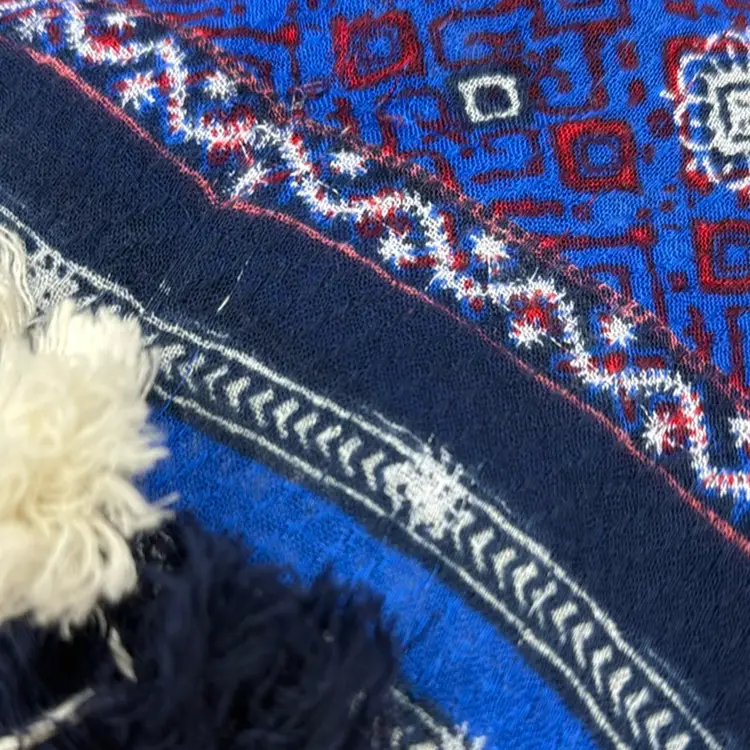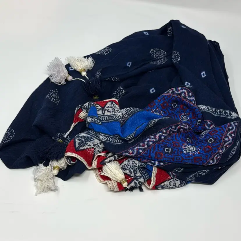 Lucky brand lightweight scarf. Very soft. Main body is navy blue with white medallions. 2 ends have a red, white and blue patterned border print. There are 2 white and 1 blue tassel on each corner. 100% Viscose Body 100% Cotton Trim