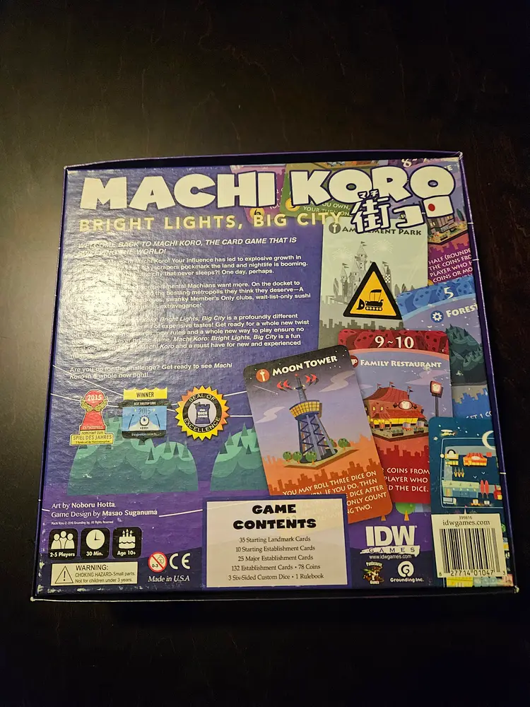 Players: 2-5 Playtime: 30 minutes Age: 10+ Designer: Noboru Hotta Publisher: IDW Games Mechanics: Dice Rolling, Open Drafting, Random Production Theme: Town-Building