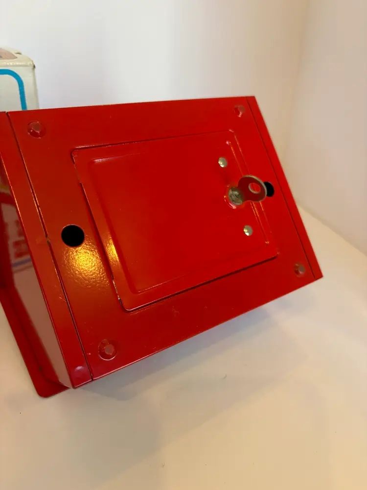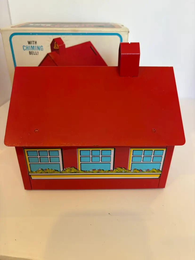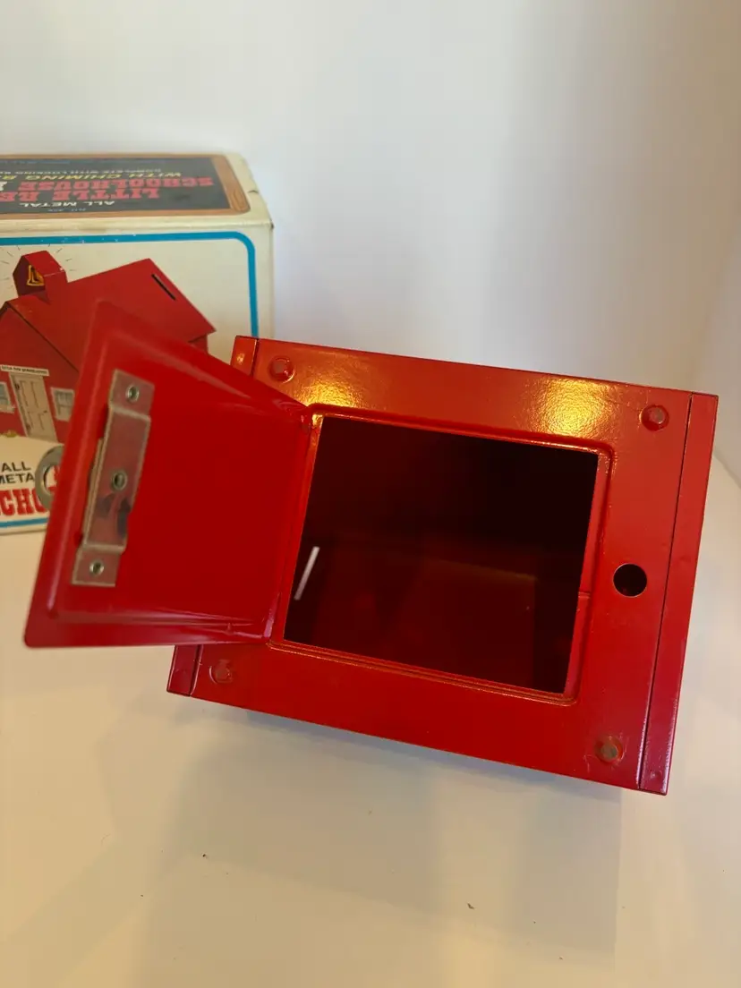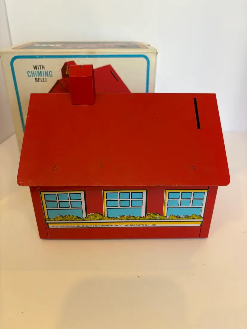Little Red Schoolhouse bank. Box and key included. All in excellent condition.