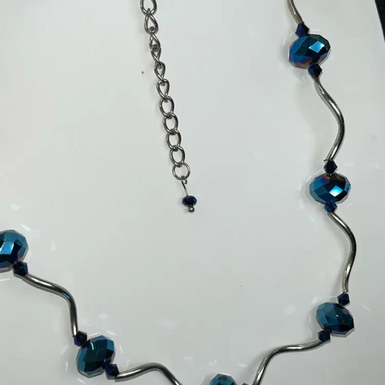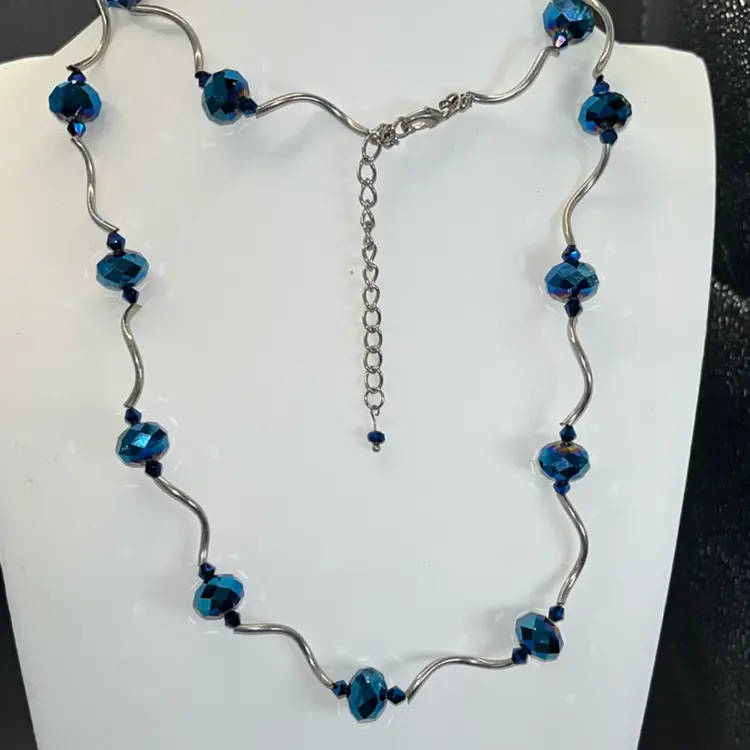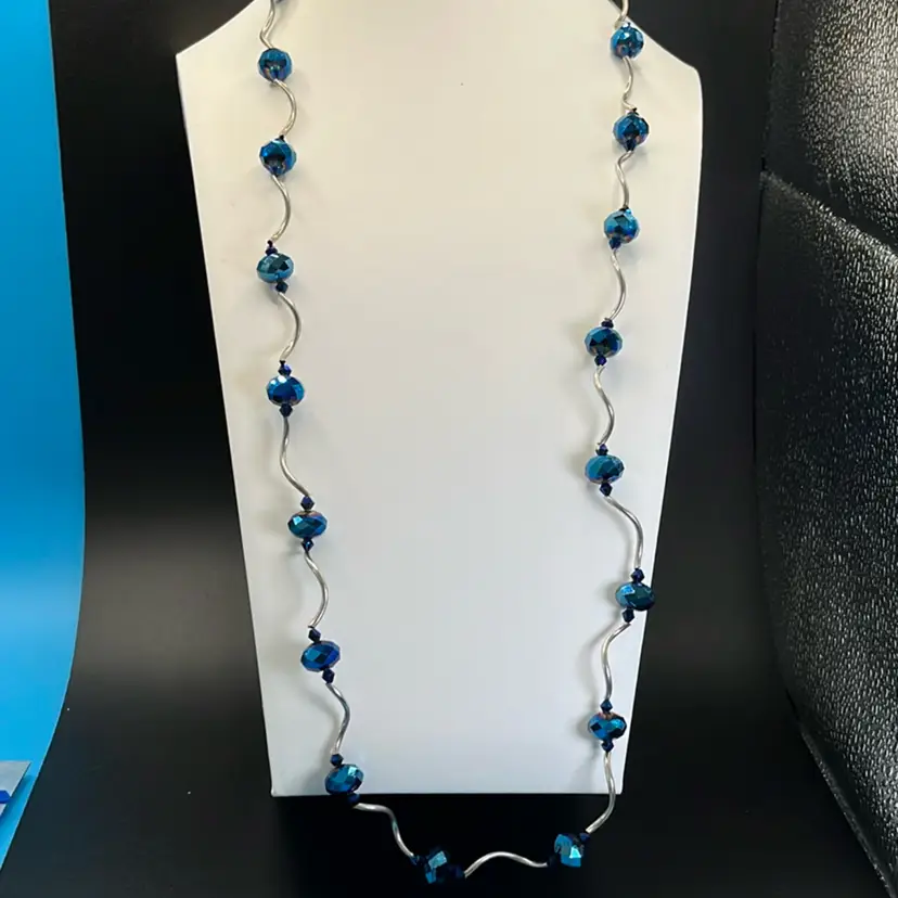 Metallic Sapphire, Blue Crystal, And Silvertone Necklace 34” Long