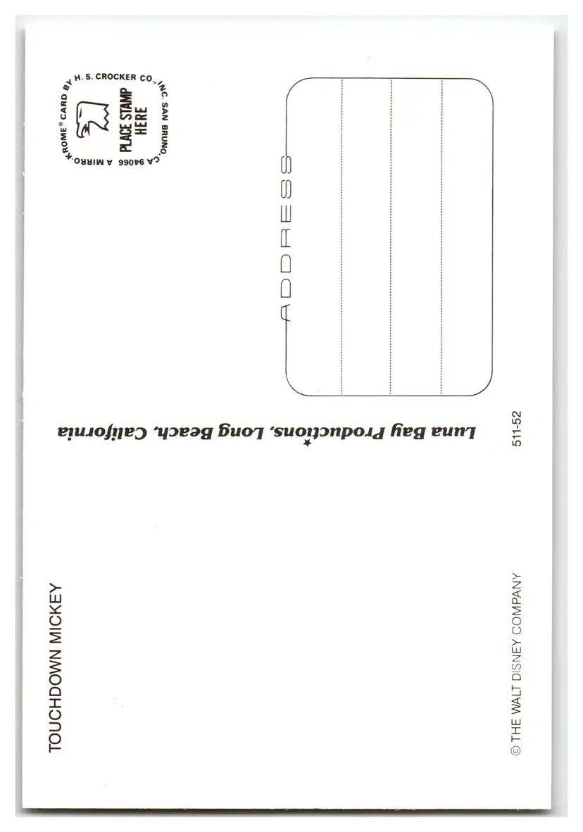 This reproduction postcard, produced by H.S. Crocker Co., Inc. and Luna Bay Productions, brings a piece of cinematic history to life. The front proudly displays the original movie poster art for "Walt Disney's Mickey Mouse in Touchdown Mickey," a United Artists Picture. It's a fantastic representation of early Disney animation and a tribute to the enduring legacy of Mickey Mouse, perfect for display or adding to a curated collection of Disneyana and animation memorabilia.