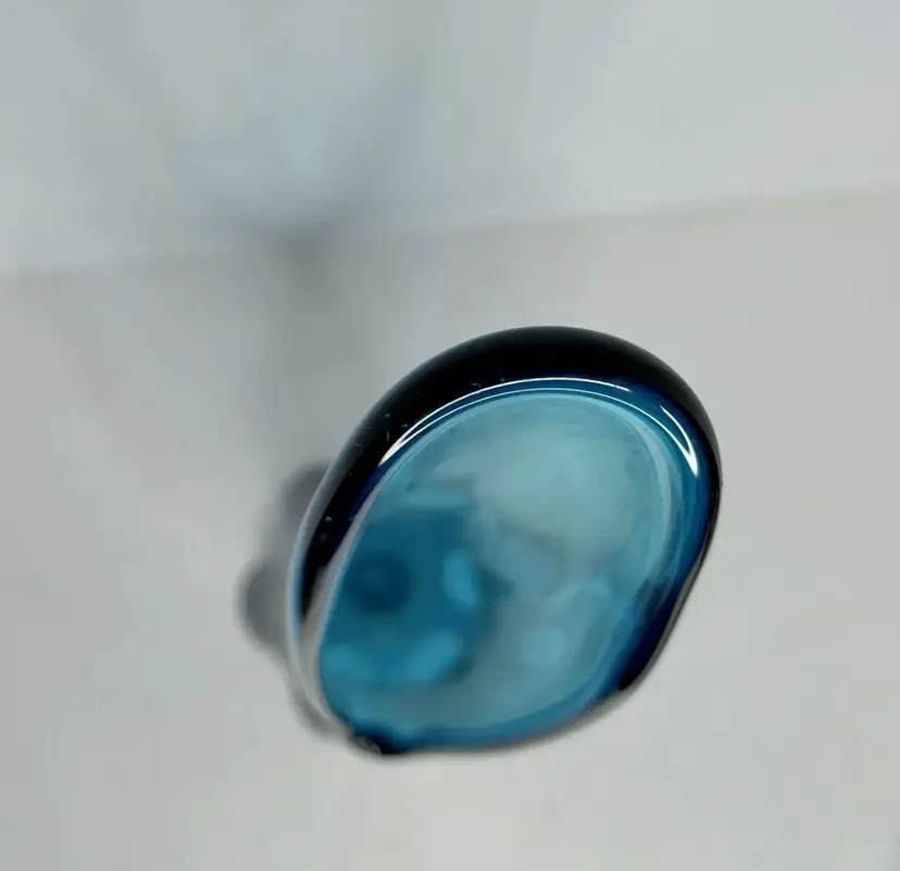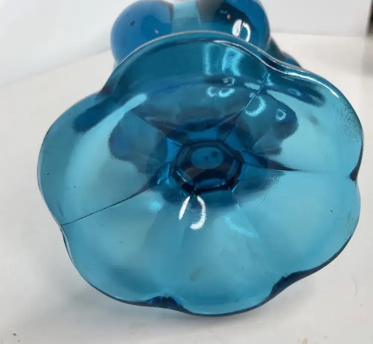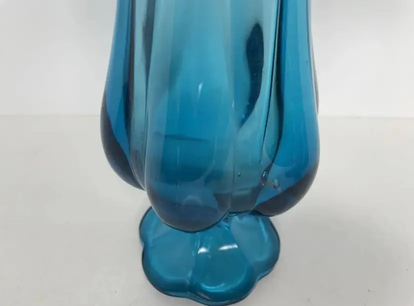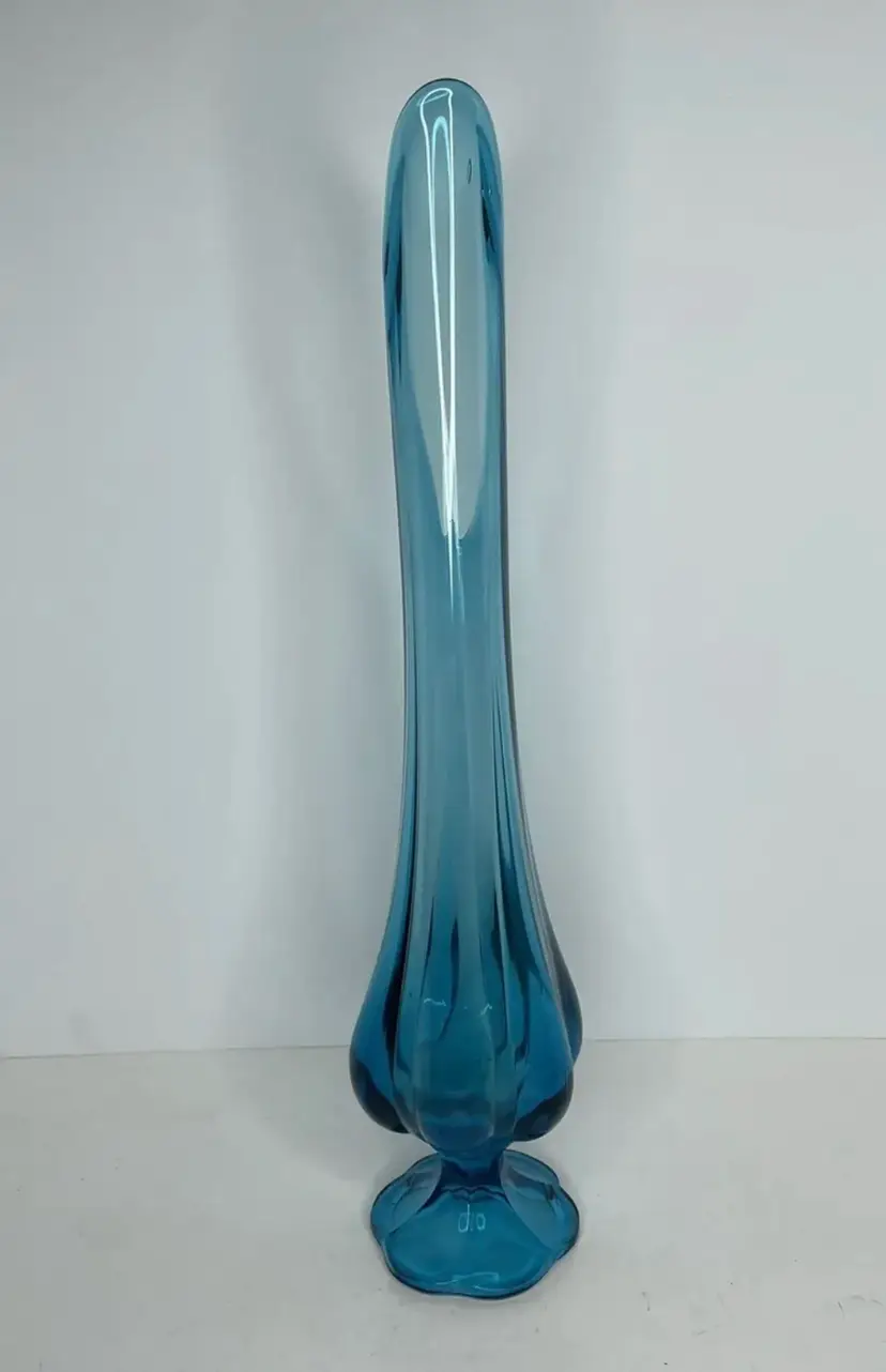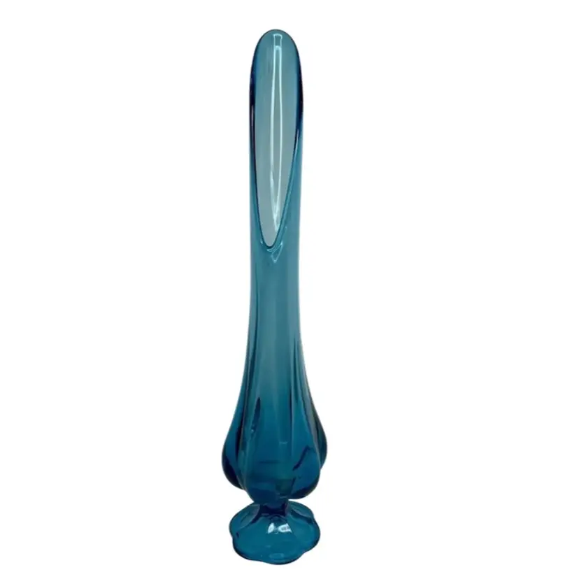 This Mid Century Modern LE Smith Swung Stretch Glass Pedestal Vase in Aqua Blue is a stunning piece that will add a touch of vintage charm to any home decor. The vase stands at 20.5” tall and features an elegant 6 petal pedestal base, making it a perfect centerpiece for your living space.