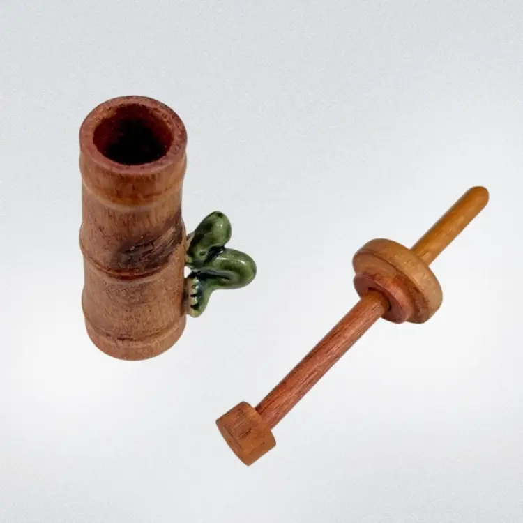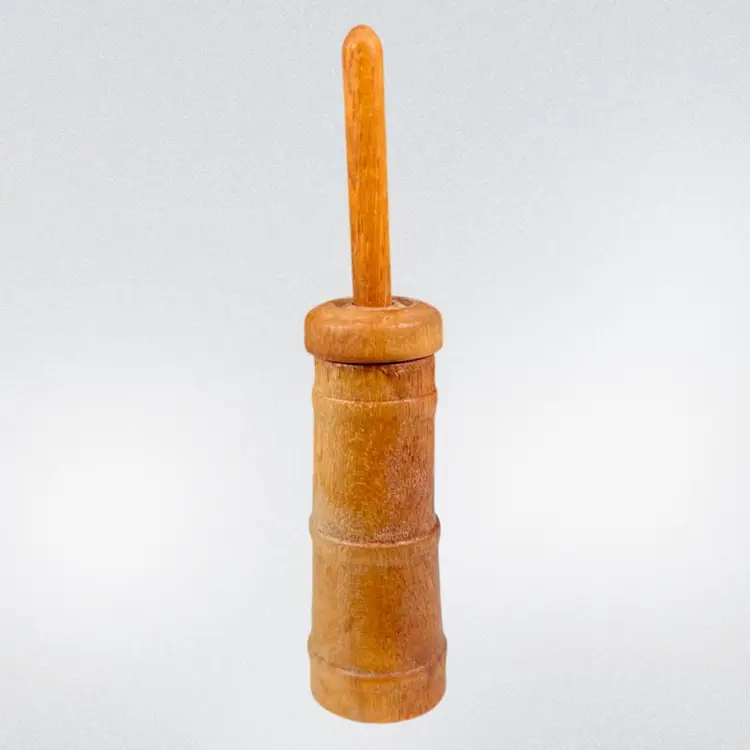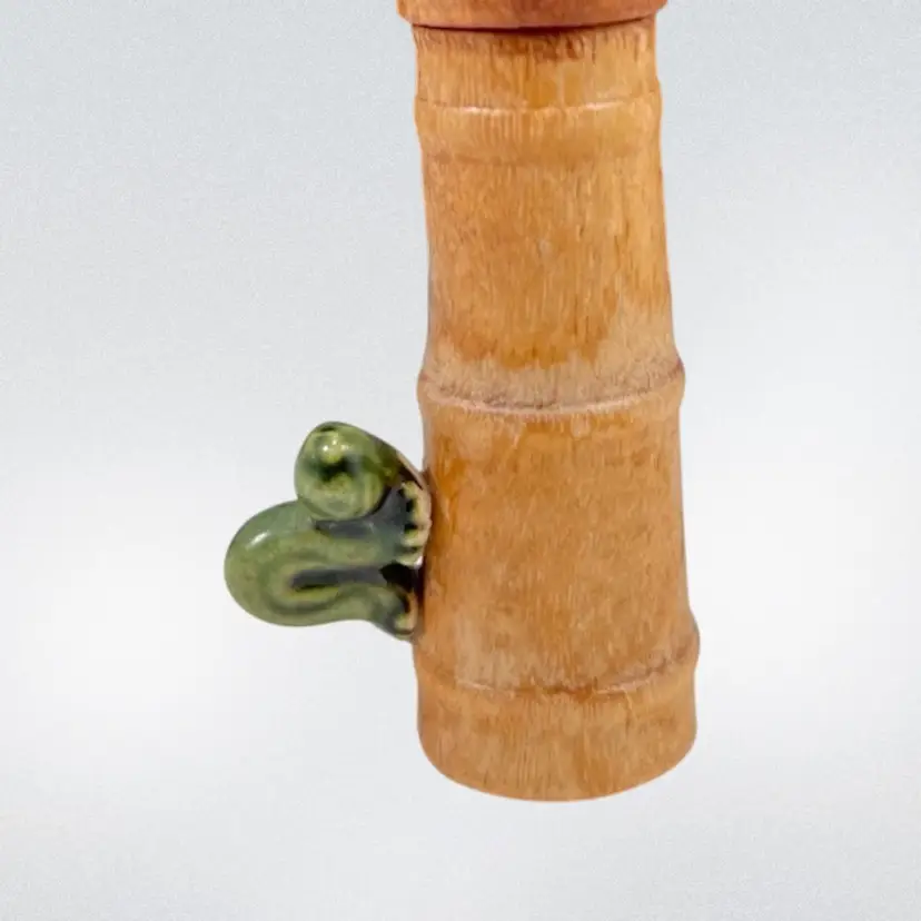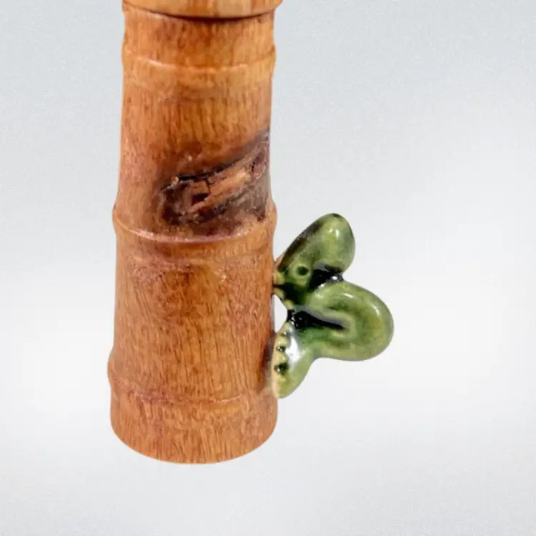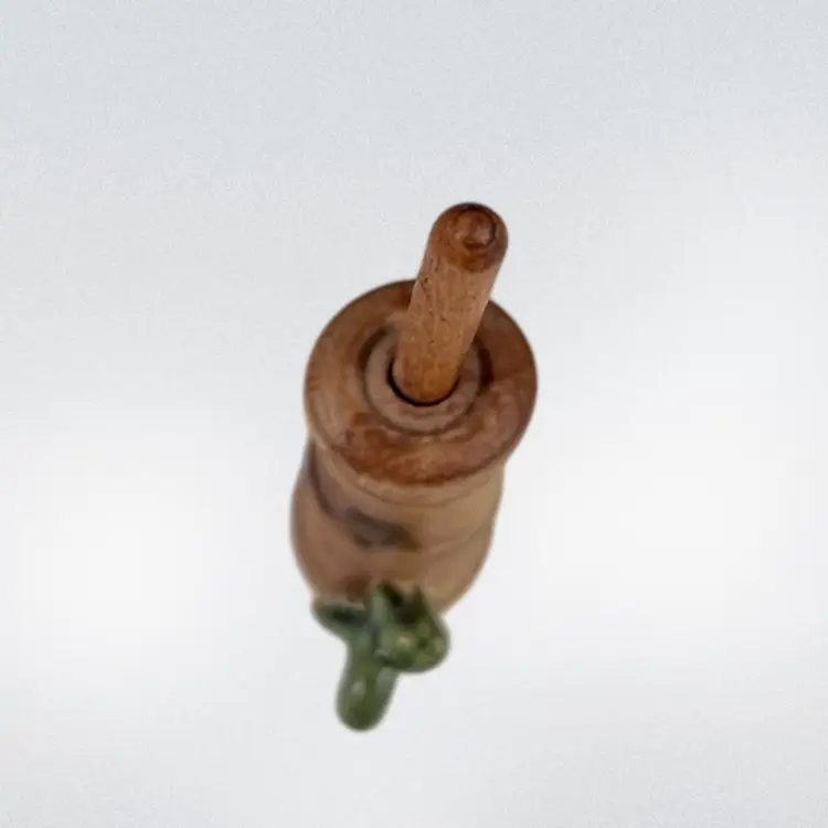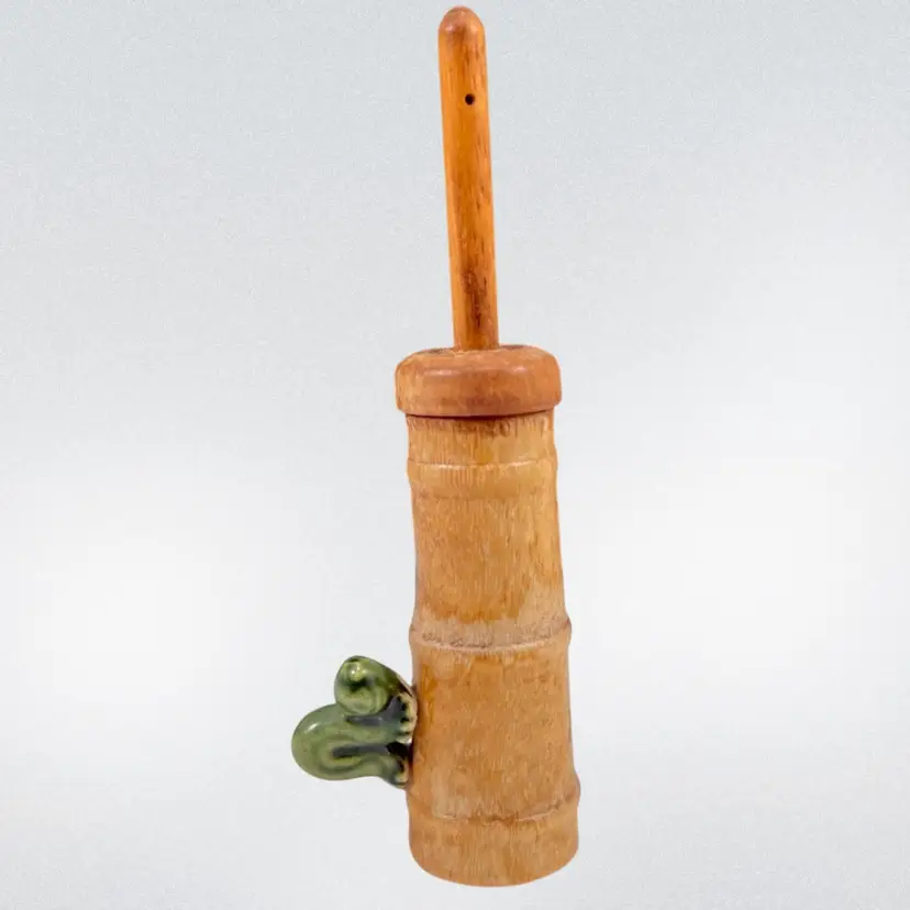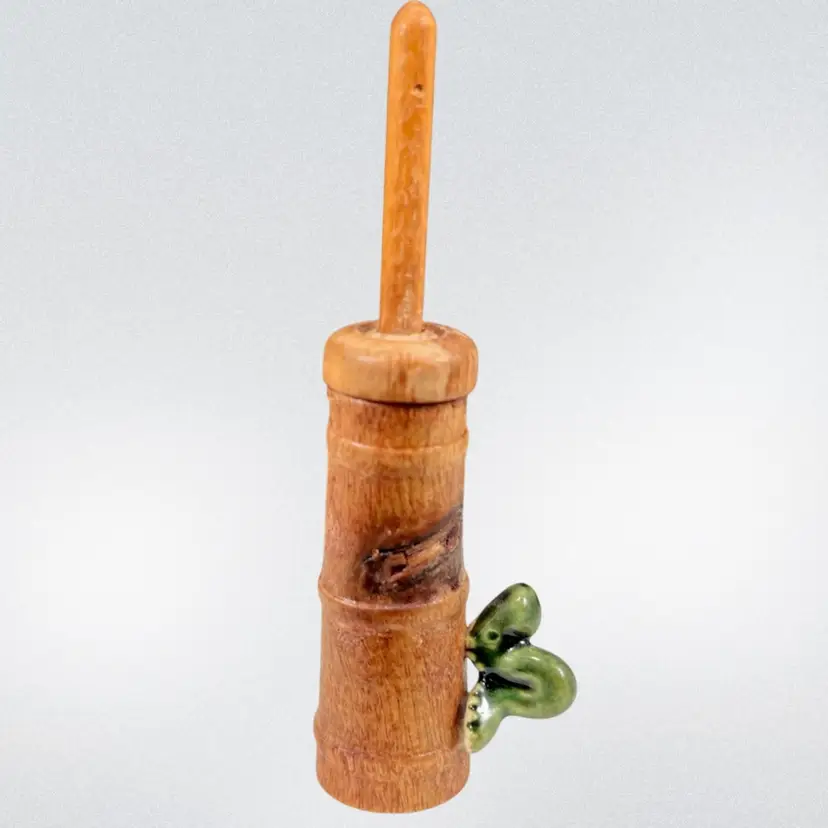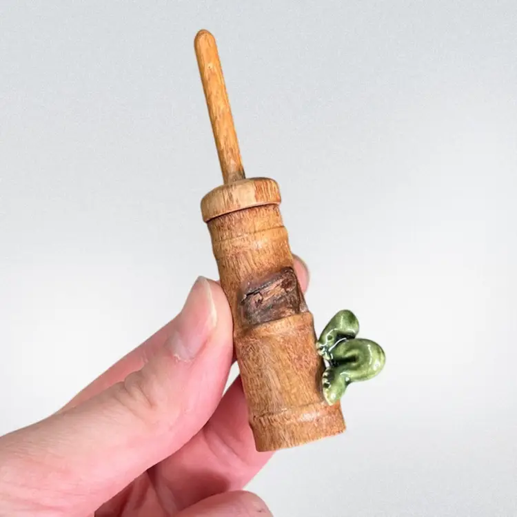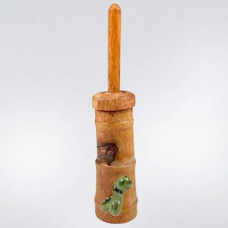 Approximately 0.75” x 1” x 3.25”. No chips or cracks. The lid can come off and the butter churn can move up and down. Caterpillar appears to be glued onto the side.