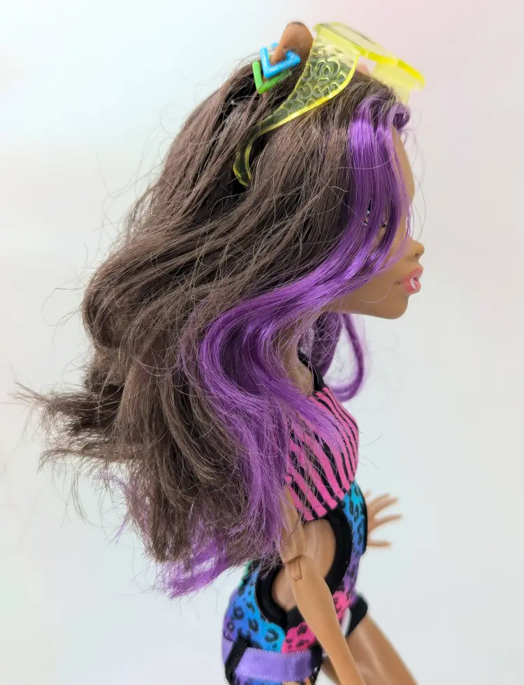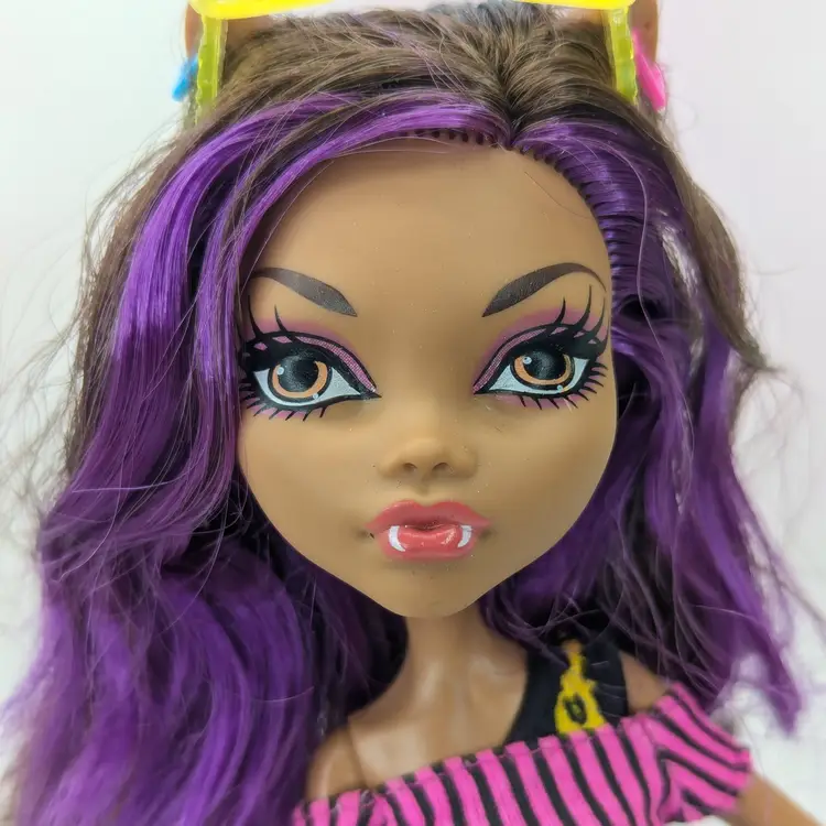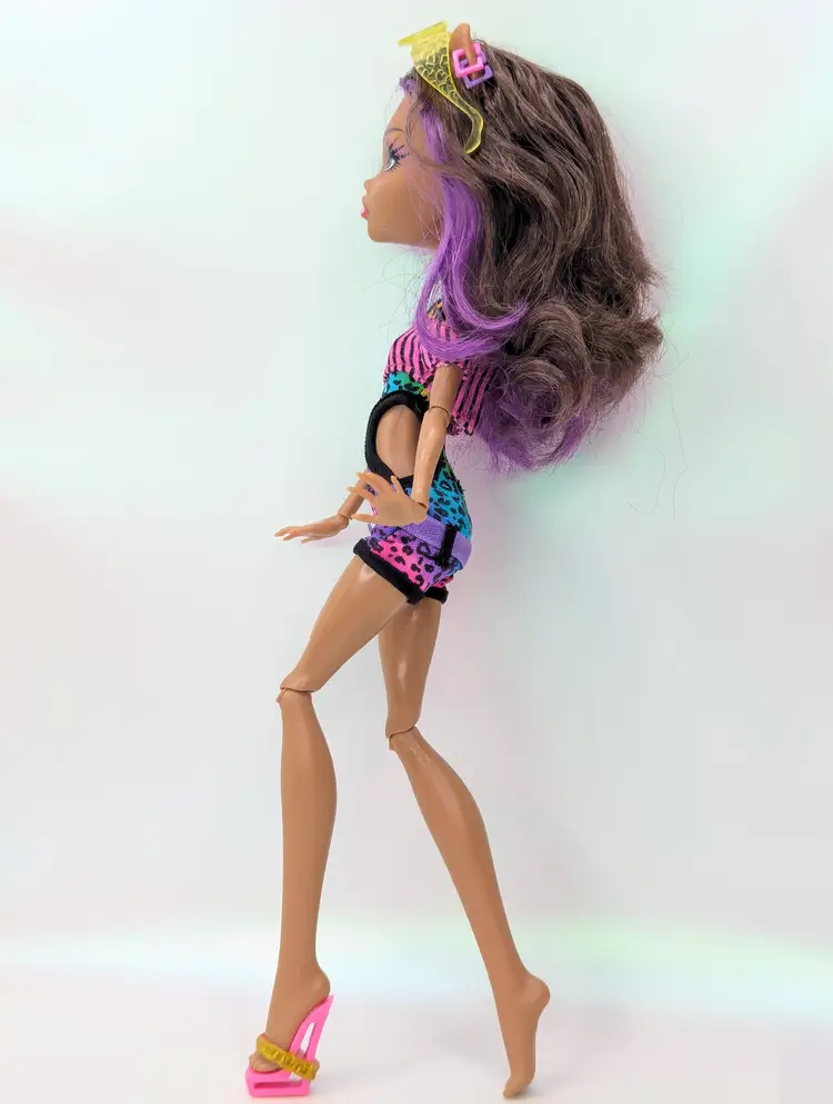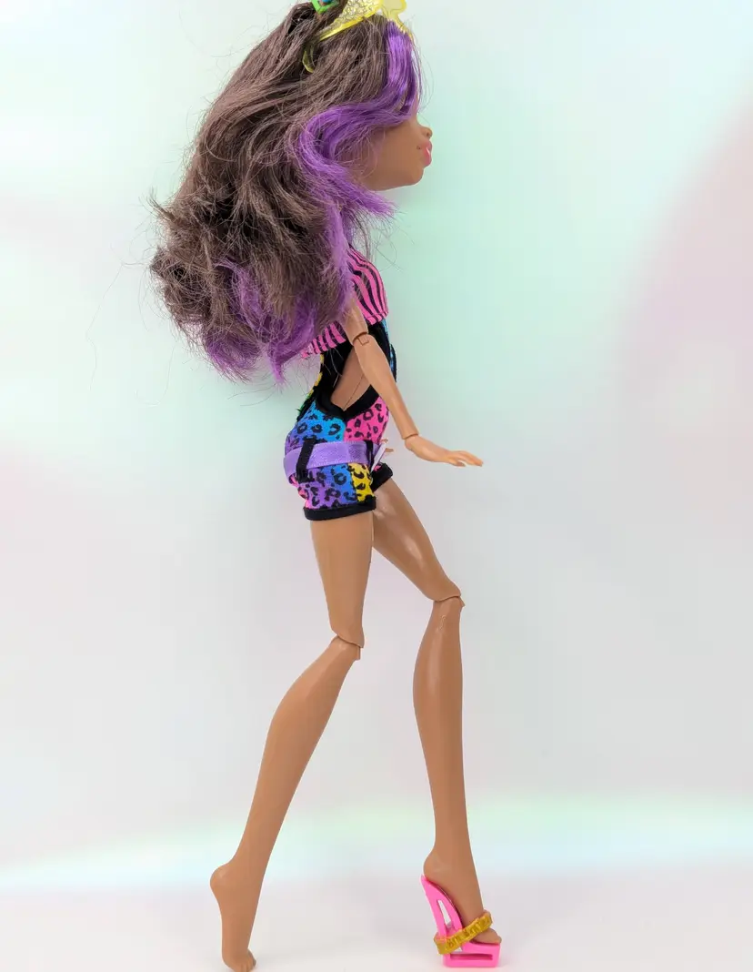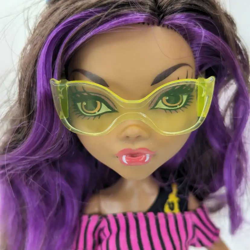 Monster High Clawdeen Wolf Gloom Beach Doll Mattel 2010 in original outfit with all Earrings, Glasses, hands and one shoe. This doll is in good condition, the only issues i see are the legs have exaggerated seams? on the the front, it looks like a scrap but its right on the thigh seam. Also her hair may need treatment for glue seepage, it feels a little greasy even though it is clean. - See all photos feel free to ask for more if needed. Doll has no lose joints, holds a pose. Nice face/make-up. Oufit is clean, no rips, tears, holes or stains. Comes from a smoke free, pet friendly home.