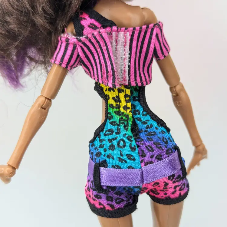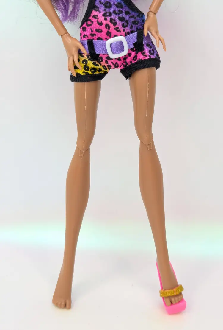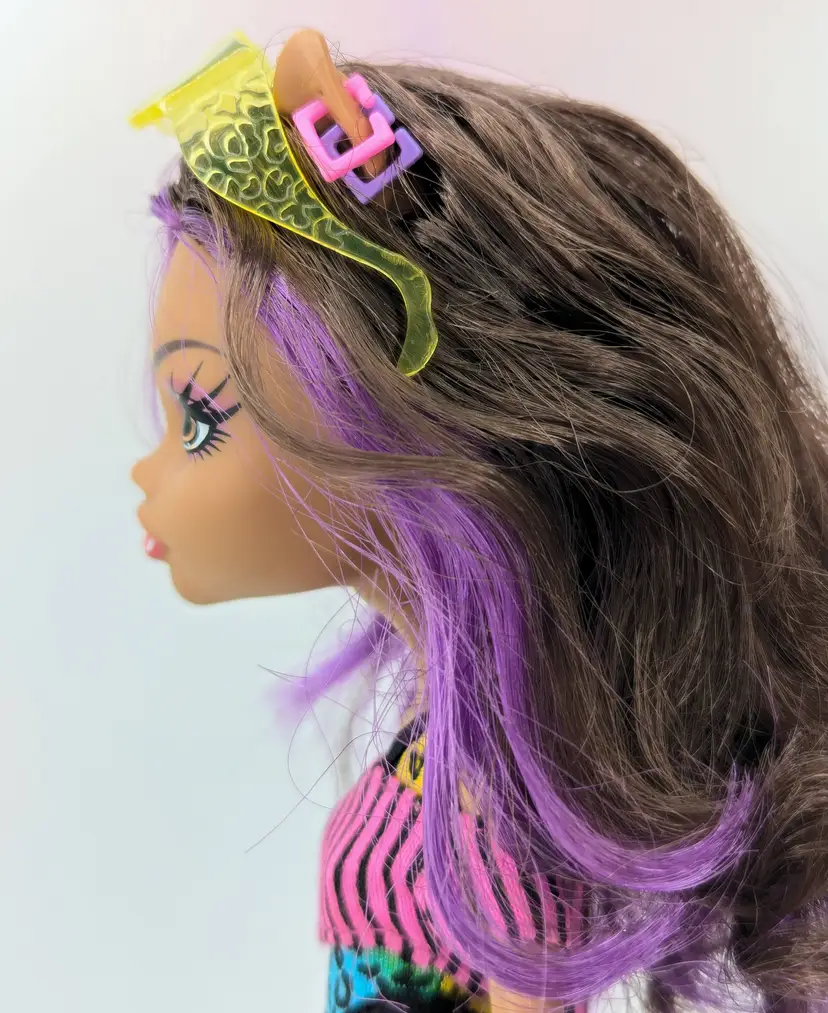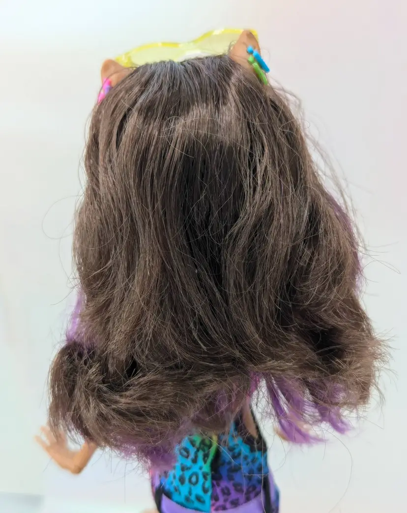 Monster High Clawdeen Wolf Gloom Beach Doll Mattel 2010 in original outfit with all Earrings, Glasses, hands and one shoe. This doll is in good condition, the only issues i see are the legs have exaggerated seams? on the the front, it looks like a scrap but its right on the thigh seam. Also her hair may need treatment for glue seepage, it feels a little greasy even though it is clean. - See all photos feel free to ask for more if needed. Doll has no lose joints, holds a pose. Nice face/make-up. Oufit is clean, no rips, tears, holes or stains. Comes from a smoke free, pet friendly home.