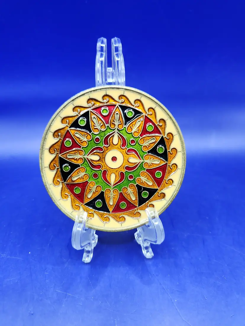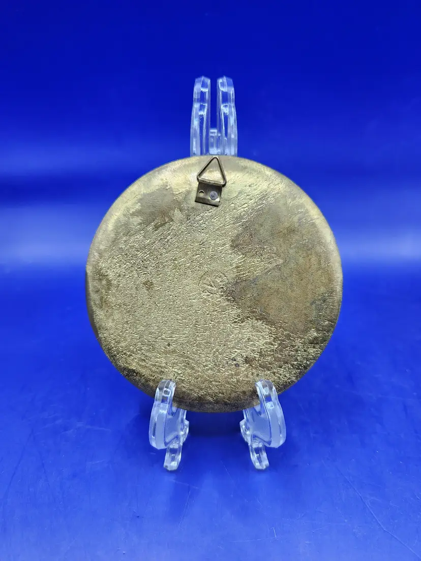 Mosaic Design Enamel on Brass Wall Art Measures 3 1/2 inches There is a mark on back but I cannot clearly make out ....inverted V with BRONZE?? Research indicates maybe Greece?? Beautiful design in vibrant colors of reds, greens, gold, creams There is wear on back Has a hook for hanging