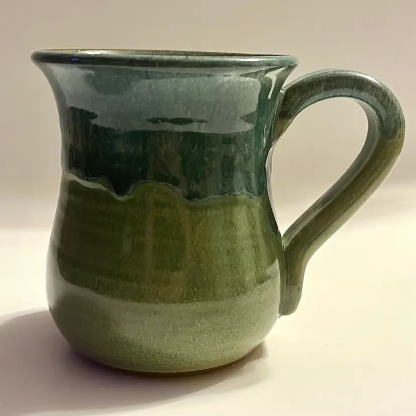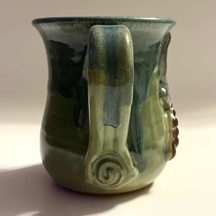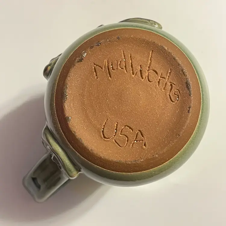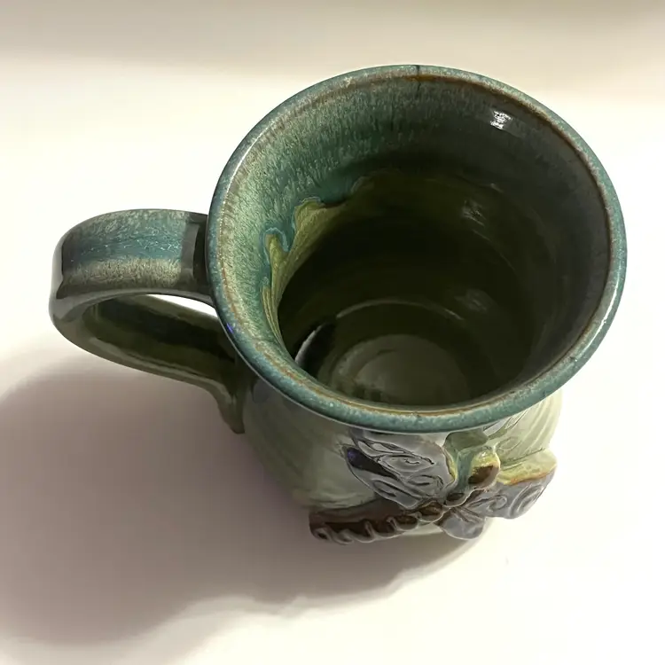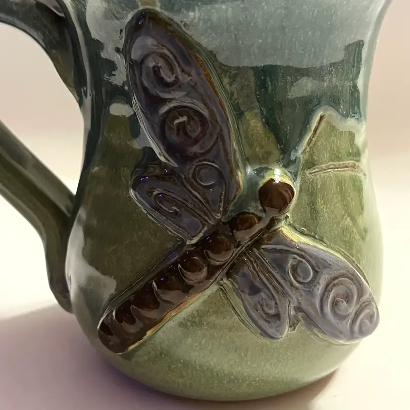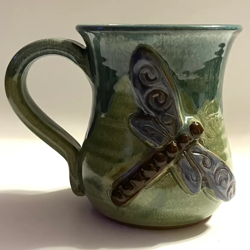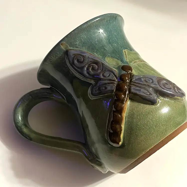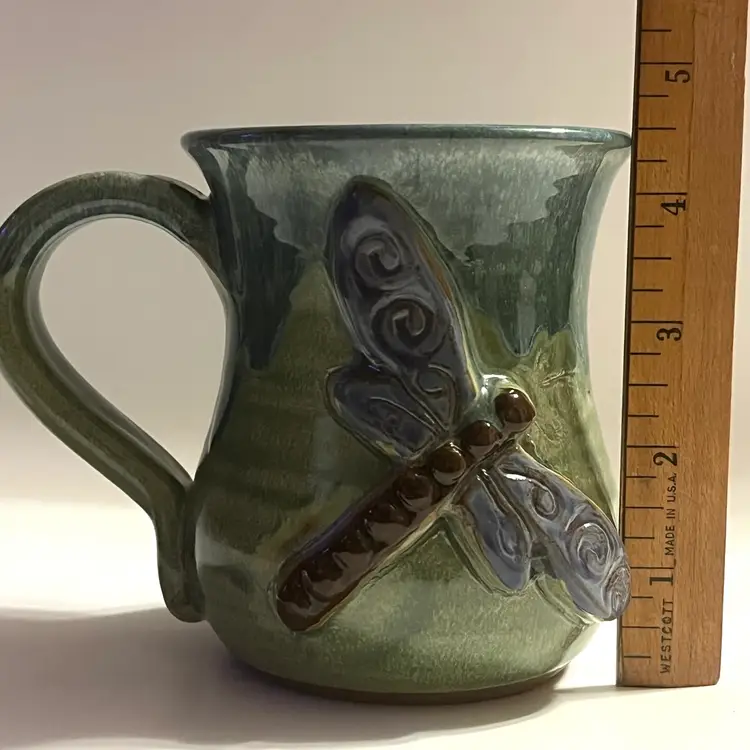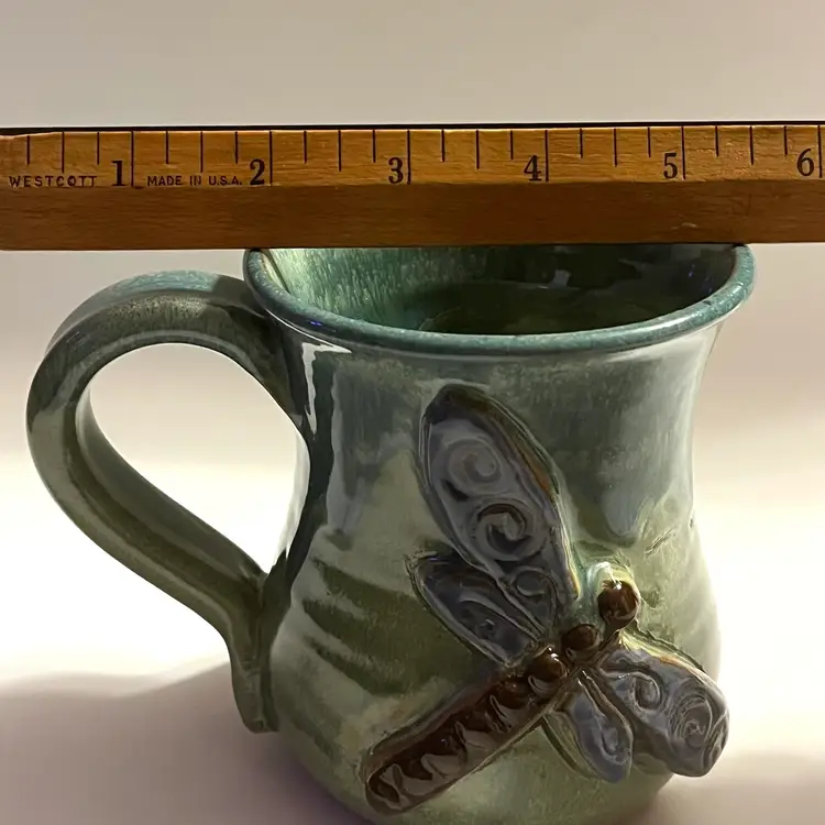 This listing is for one MudWorks Pottery Dragonfly mug, handmade in Pennsylvania, USA and finished in a beautiful blue‑green drip glaze. The glaze pools and flows organically across the stoneware surface, creating natural variation that makes each mug one‑of‑a‑kind. A dimensional sculpted dragonfly is applied to the front—one of MudWorks’ most beloved and recognizable designs. Signed on bottom "MudWorks USA".