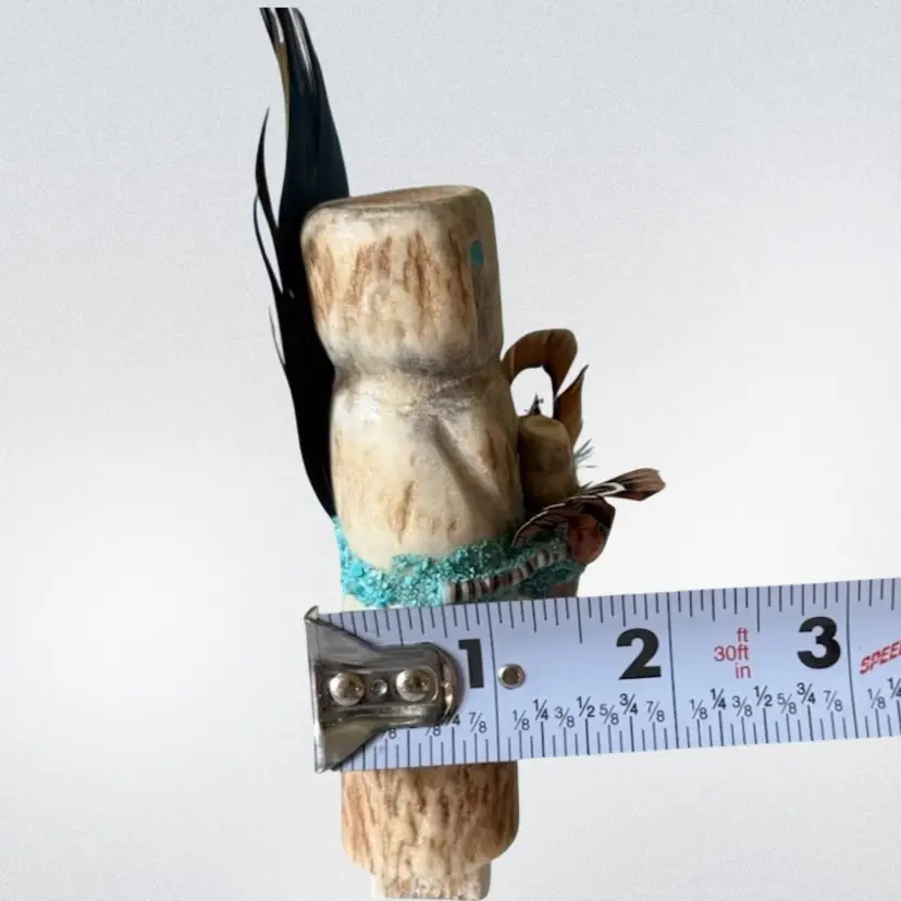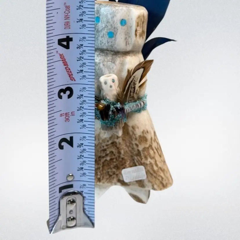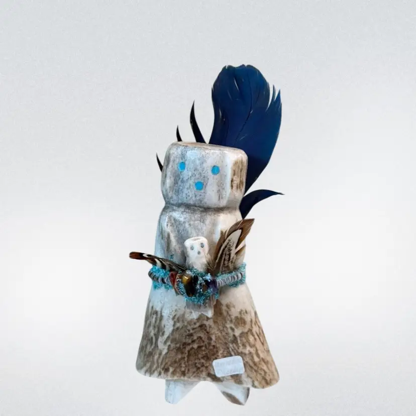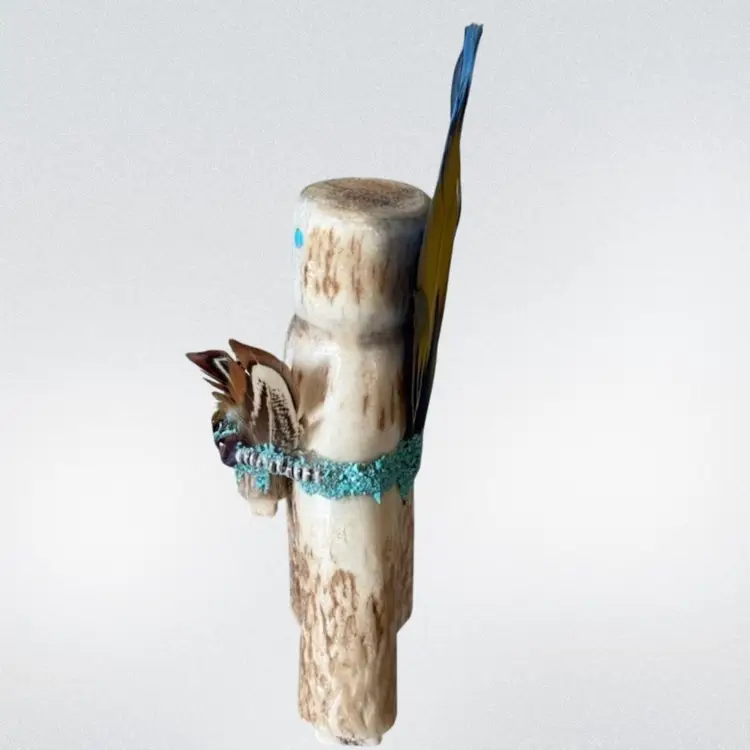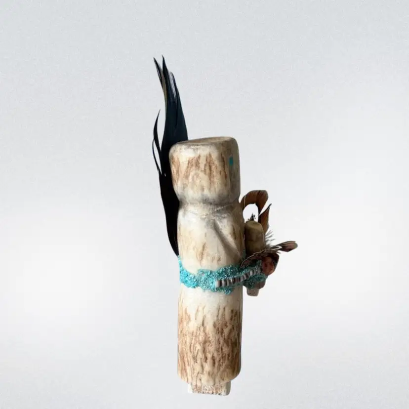 The doll is carved from antler by Zuni artist Marvelita Phillips. She is holding a baby with Turquoise eyes, feather, and bead laden gift bundles. The Zuni Native Americans are renowned worldwide in the art of Fetish carving. Collectors prize Zuni fetishes for their beauty as a Native American art form.