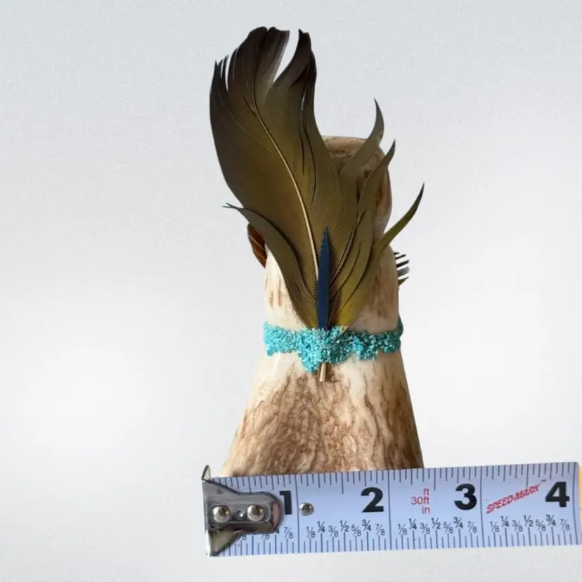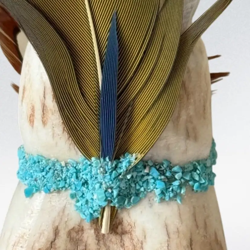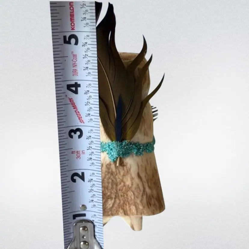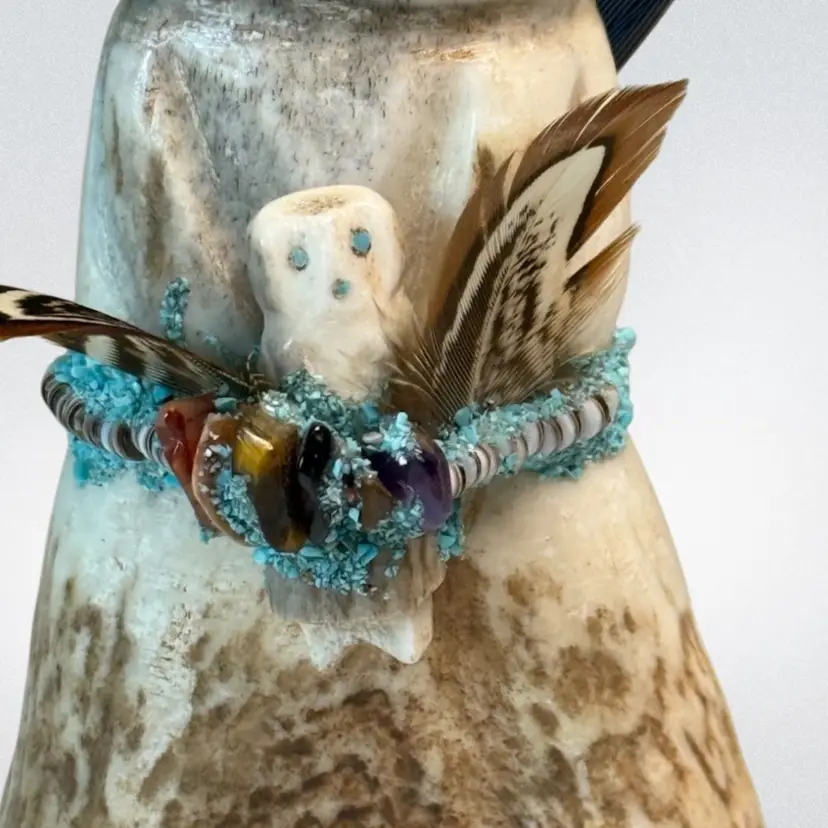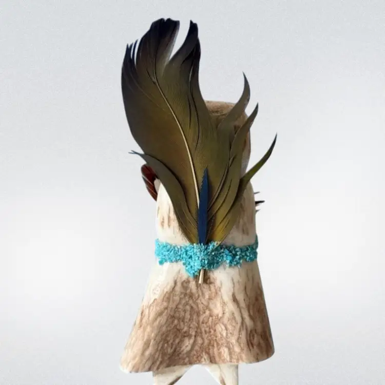 The doll is carved from antler by Zuni artist Marvelita Phillips. She is holding a baby with Turquoise eyes, feather, and bead laden gift bundles. The Zuni Native Americans are renowned worldwide in the art of Fetish carving. Collectors prize Zuni fetishes for their beauty as a Native American art form.