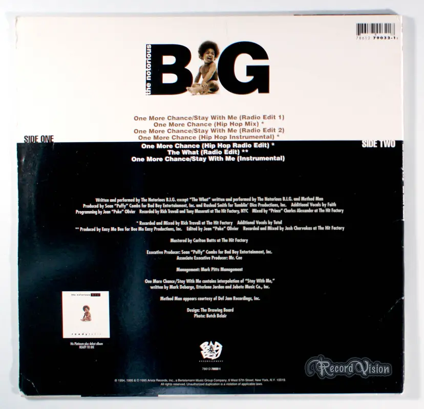 One More Chance, by Notorious B.I.G., is a single release featuring multiple versions and remixes of the title track, including the popular Stay with Me remix that samples DeBarge and incorporates uncredited vocals from Faith Evans. This release stands out for its iconic music video directed by Hype Williams, which showcases a lavish underground party with numerous celebrity cameos from the mid-1990s hip-hop and R&B scene. The remix version became historically significant as one of Biggie's biggest commercial successes, tying the record for the highest-debuting single on the Billboard Hot 100 at the time. Fan-favorites on the single include the smooth, radio-friendly Stay with Me remix and the hip-hop remix featuring Total. The lead single One More Chance / Stay with Me (Remix) was a major hit, peaking at No. 2 on the Billboard Hot 100 and No. 1 on the Hot R&B/Hip-Hop Songs chart.