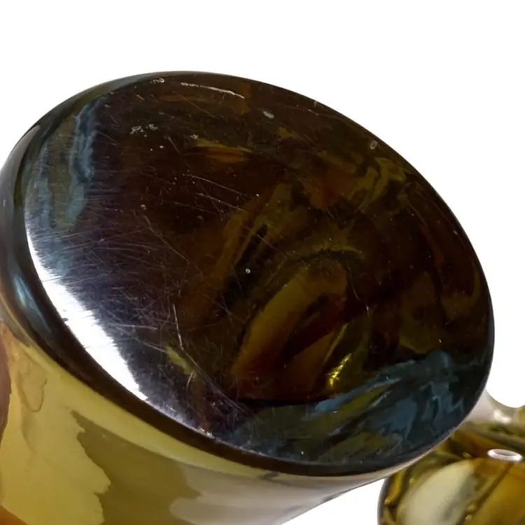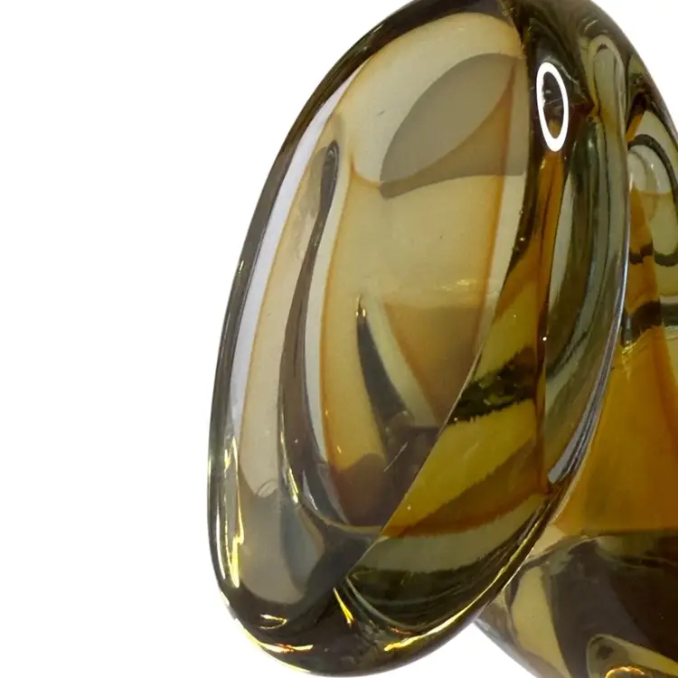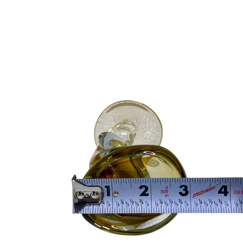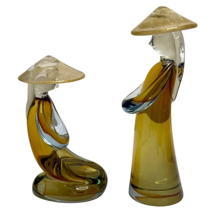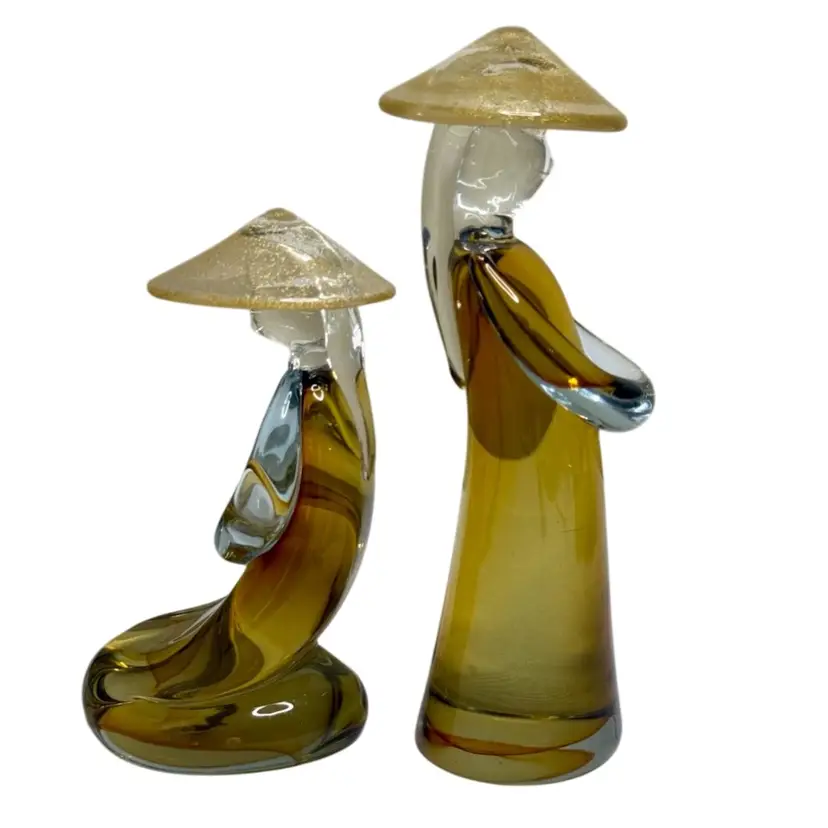 A stunning pair of Mid 20th Century Murano Glass Asian figures. These amber sommerso gold Aventurine Condition: Light surface scratches on the base. Standing figurine has some tiny air bubbles and possible tooling marks. Tooling marks are near the bottom right side of dress and can be felt, a closeup and distant picture is shown. Also, a tiny air bubble that surfaced near the base. The sitting figurine has a small air bubble in her arm. Measurements are approximate. Large: 7-1/2” x 2-1/4” x 2-1/4” Small: 5-3/4” x 2-1/2” x 3”. Please see pictures for condition and measurements as they are a part of the description. H-108 Thank you for looking!