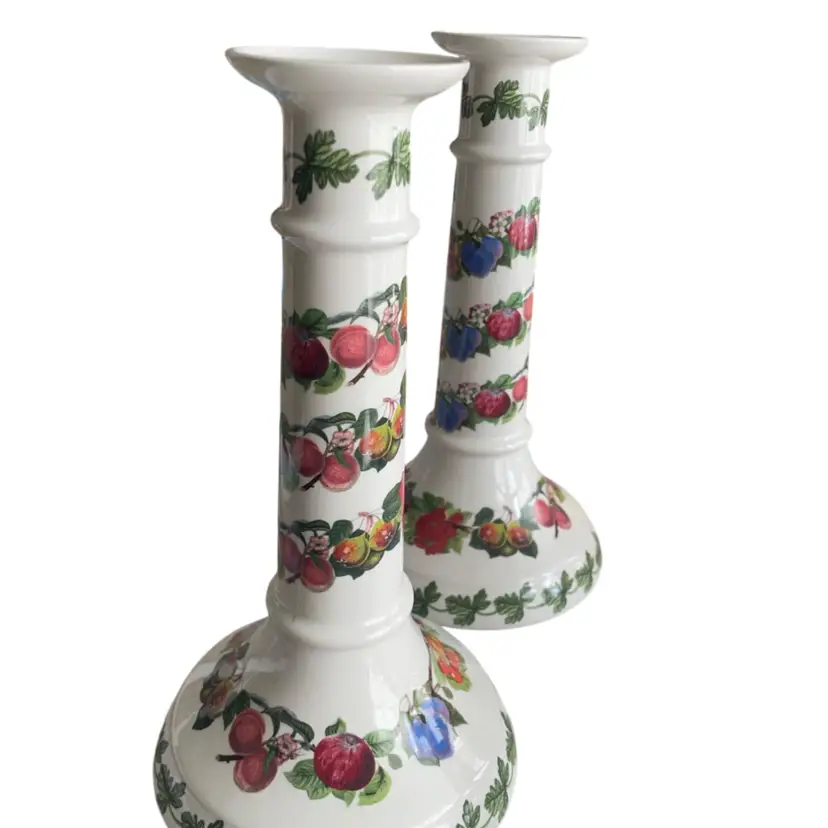 This is a pair of Portmeirion Pomona candlesticks featuring the "Fruit Garland" pattern. They are part of the Pomona range, named after the Roman goddess of fruit. The design, which includes various fruit motifs, was created by Susan Williams-Ellis. These are collectible items, often found in vintage or pre-owned condition.