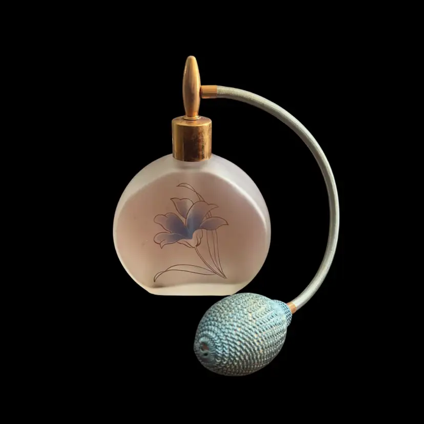 Perfume Bottle w/ Atomizer Frosted Vintage Glass Blue Flower | 5” *read