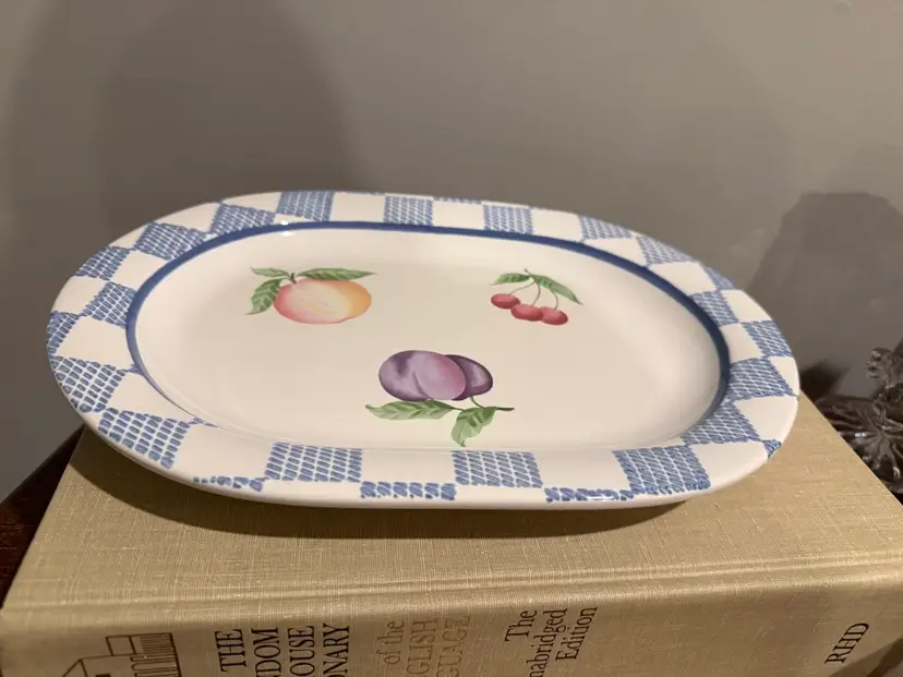 Pfaltzgraff Hopscotch Fruit Oval Serving Platter featuring a charming blue and white checkered border with central peach, plum, and cherry motifs. This durable stoneware piece is perfect for farmhouse, country, or cottagecore kitchen aesthetics.