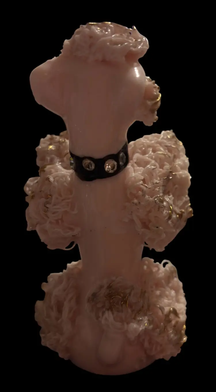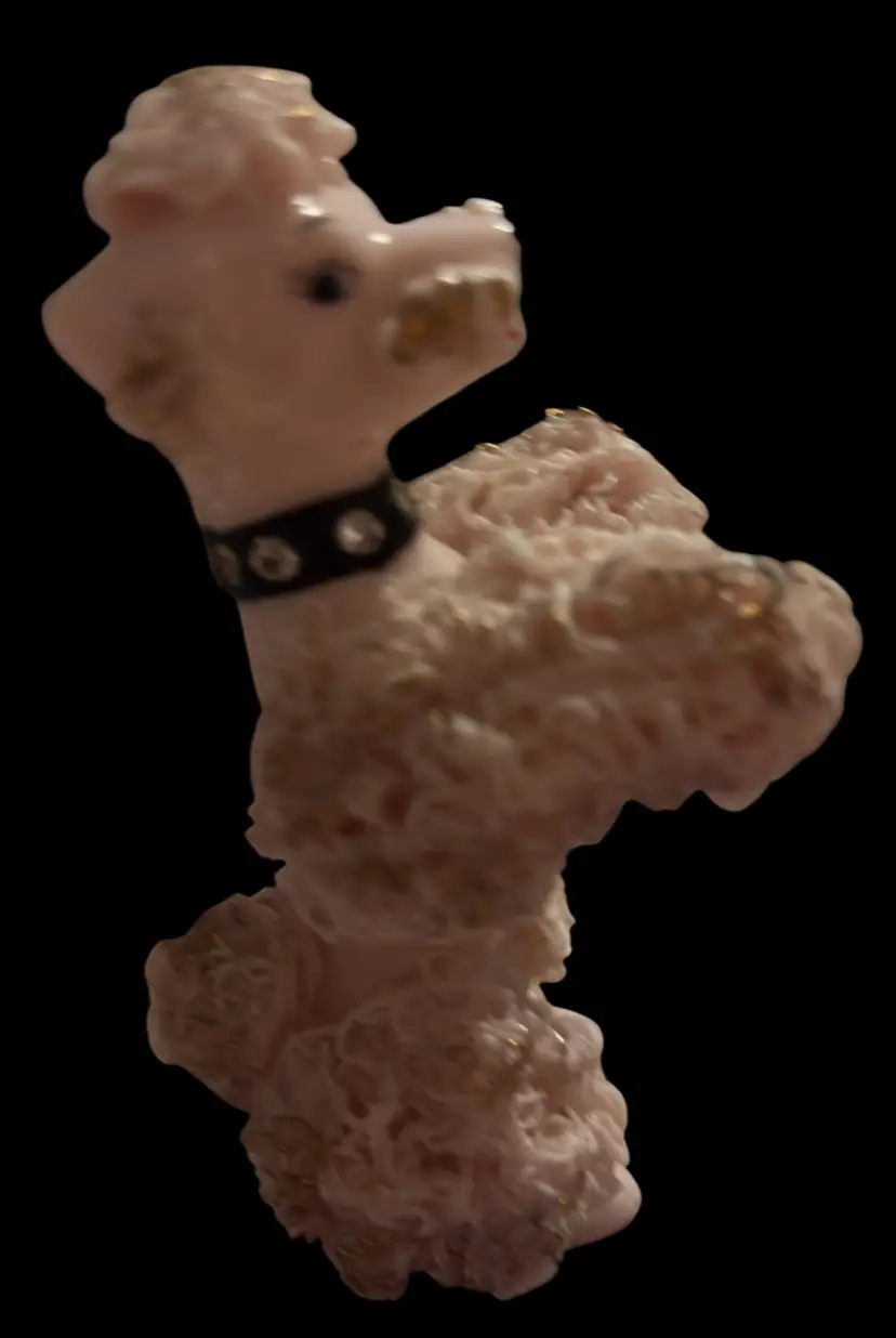 The item pictured is a vintage Lefton pink spaghetti poodle figurine, likely from the 1950s.