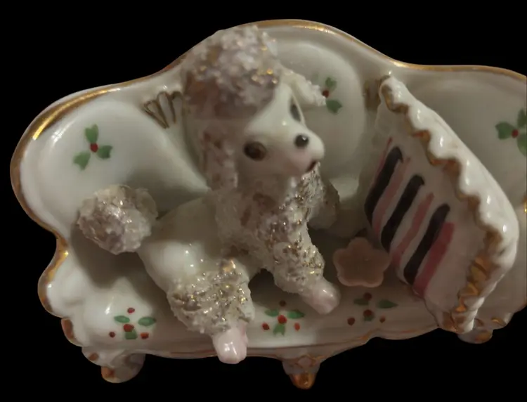 It features a white poodle with a textured, "spaghetti" or "sugar" glaze on its fur, sitting on a couch decorated with holly-like decals and gold trim.