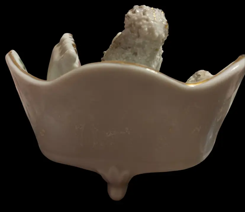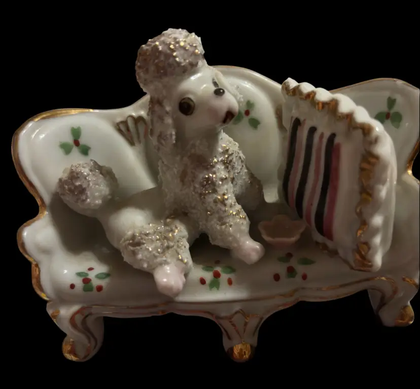 This is a vintage Japanese porcelain spaghetti poodle figurine on a couch.
