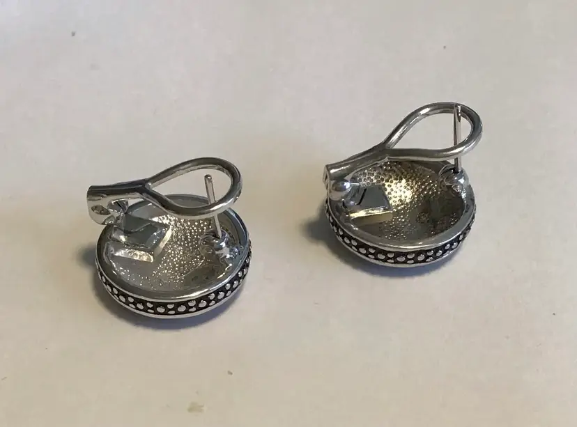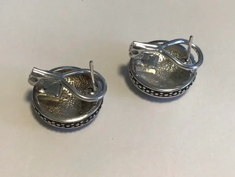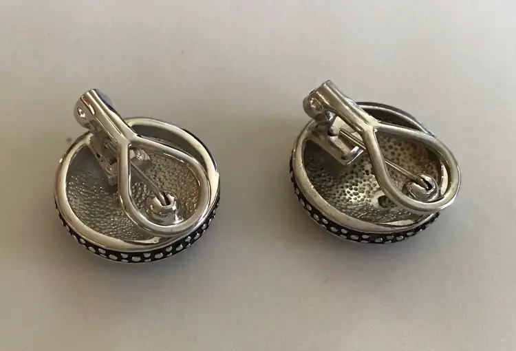 Safari striped silver tone & black enamel 3/4” round. Converts from pierced to clip on, very unique. #695