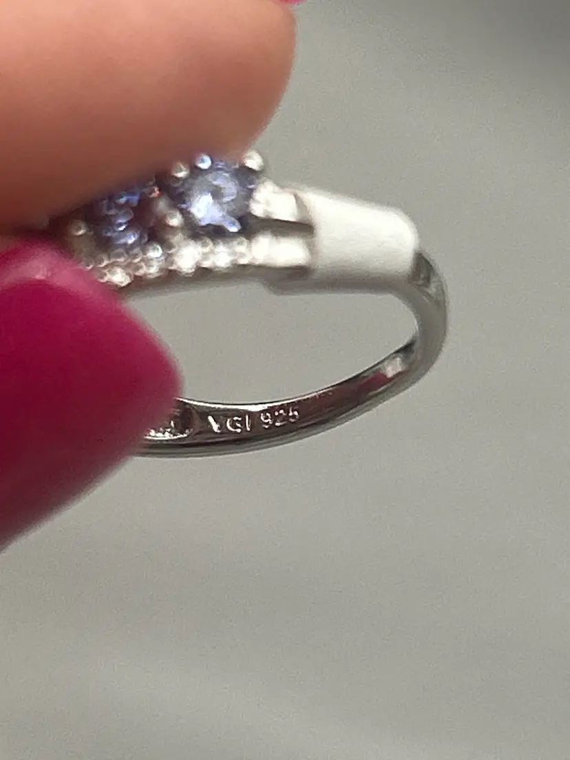 The ring is stamped YCJ 925, confirming solid sterling silver. The gemstones have been tested with a Presidium tester and register in the tourmaline / aquamarine range, confirming they are genuine gemstones. Due to overlap in gemstone readings and the purple coloration, the exact gemstone type is unverified and not lab-certified, so this piece is offered as natural purple gemstones.