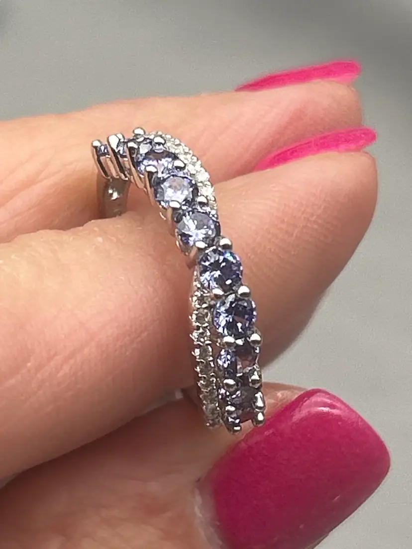 This beautiful sterling silver band features a row of sparkling purple to lavender gemstones set across the top, accented with a delicate line of clear stones for added brilliance. The stones catch the light with soft violet flashes, giving the ring a refined, romantic glow that’s perfect worn alone or stacked.