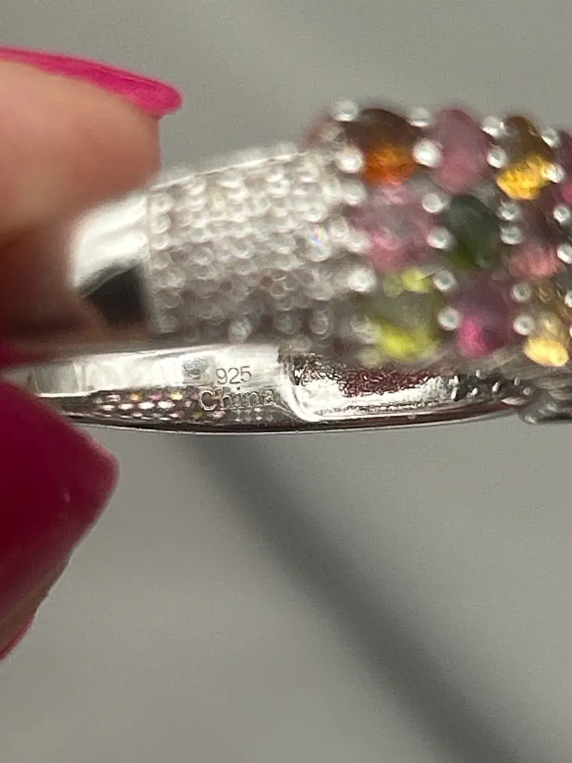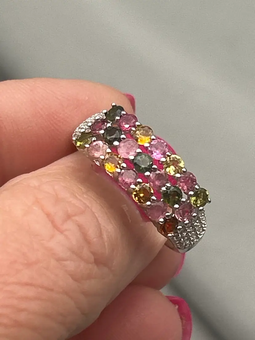 Details • Ring Size: 8 3/4 • Metal: Solid sterling silver • Hallmark: 925 China • Gemstones: Natural tourmaline (multi-color) • Style: Statement band, cocktail ring, everyday luxury • Condition: Very good pre-owned condition • Band Width: Wide, triple-row design