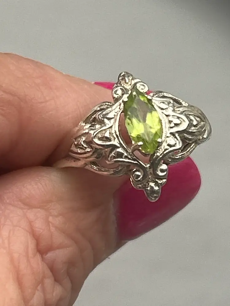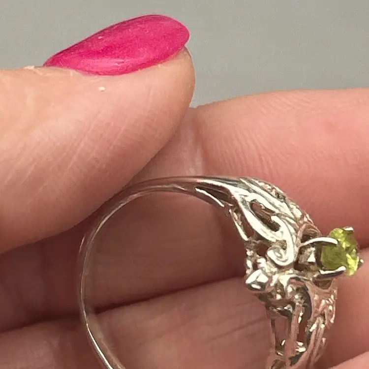 Details • Metal: Sterling Silver (marked 925) • Stone: Peridot (green gemstone) • Ring Size: 8 3/4 • Setting Style: Filigree / ornate scrollwork • Band Style: Split-shank with openwork details • Condition: Very good vintage condition (light surface wear consistent with age)