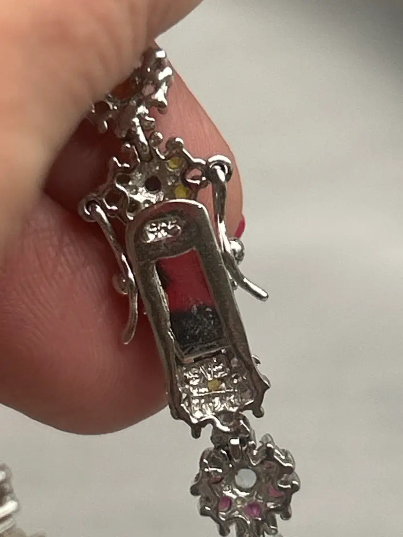 Details • Length: 7 inches • Weight: 15.7 grams • Metal: Solid sterling silver • Hallmark: 925 • Closure: Box clasp with safety • Style: Floral link bracelet, statement color bracelet • Condition: Very good pre-owned condition
