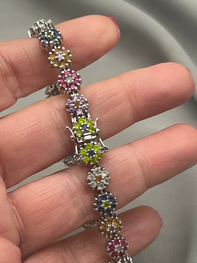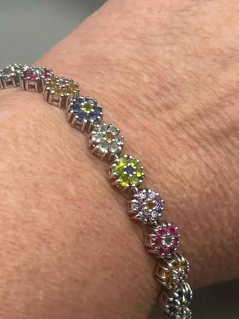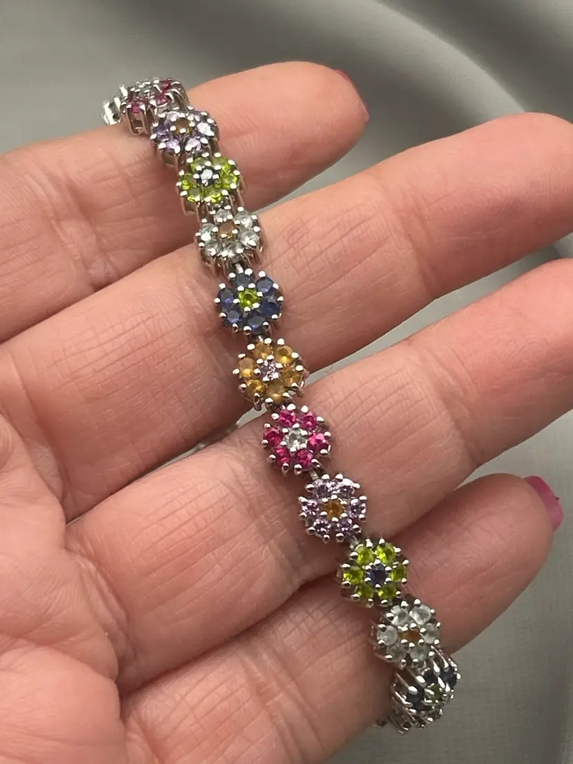 Set in solid sterling silver, this bracelet features a series of floral cluster links, each one blooming with a mix of colorful gemstones in shades of pink, lavender, blue, golden yellow, and fresh green. Each “flower” sparkles with its own personality, creating a rainbow garden effect around the wrist. The alternating colors give this piece movement, playfulness, and serious visual impact.