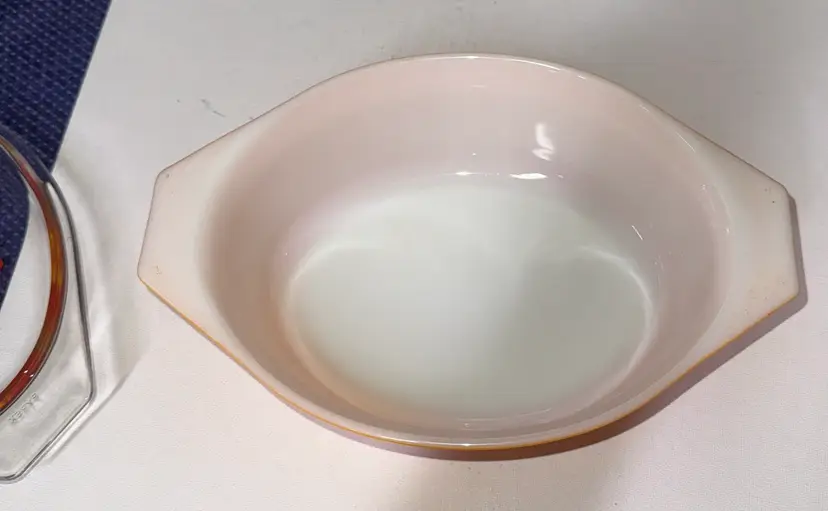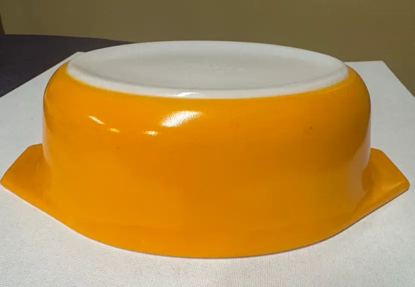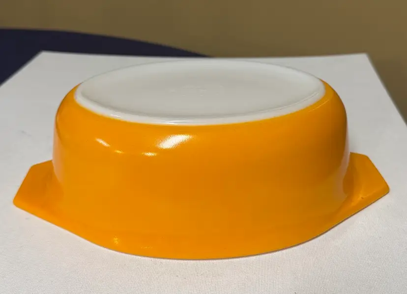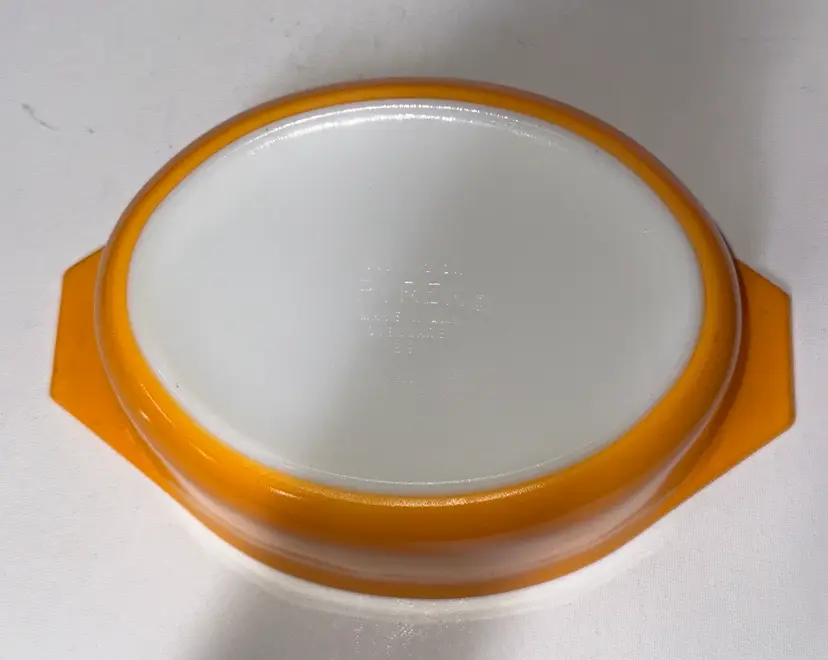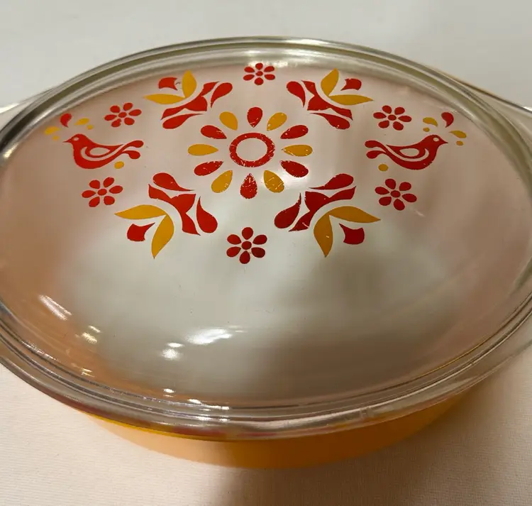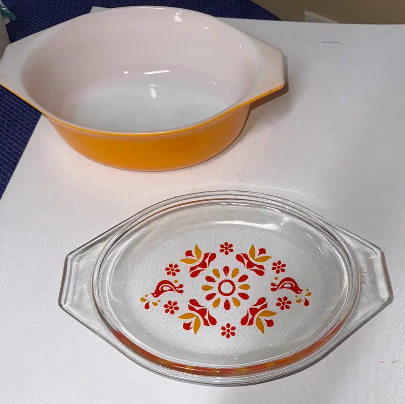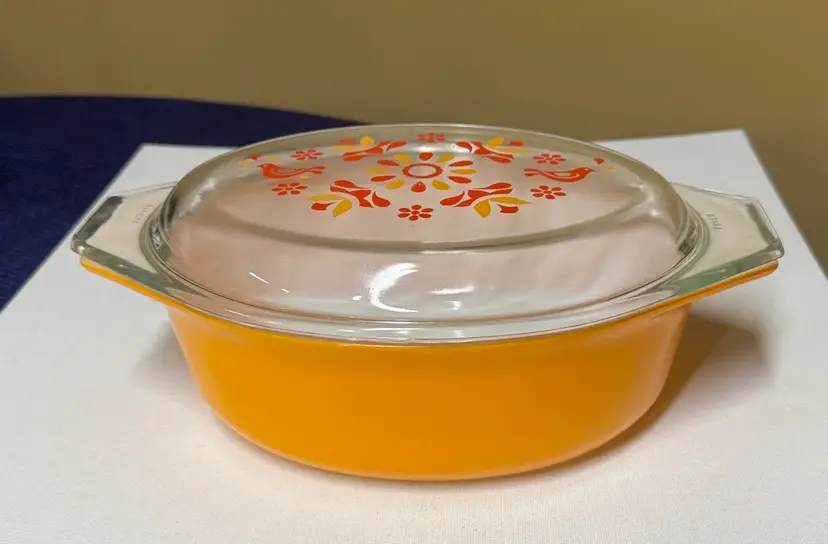 vintage pyrex 043 1 1/2qt oval casserole dish orange Rare W/ Lid Friendship patter with Red Chickens and tulips 10.25” handle to handle by 7” by 3” Charming orange dish with floral glass lid. Ideal for baking and serving. Excellent condition with very few scratches mostly on the lid (112610192513)